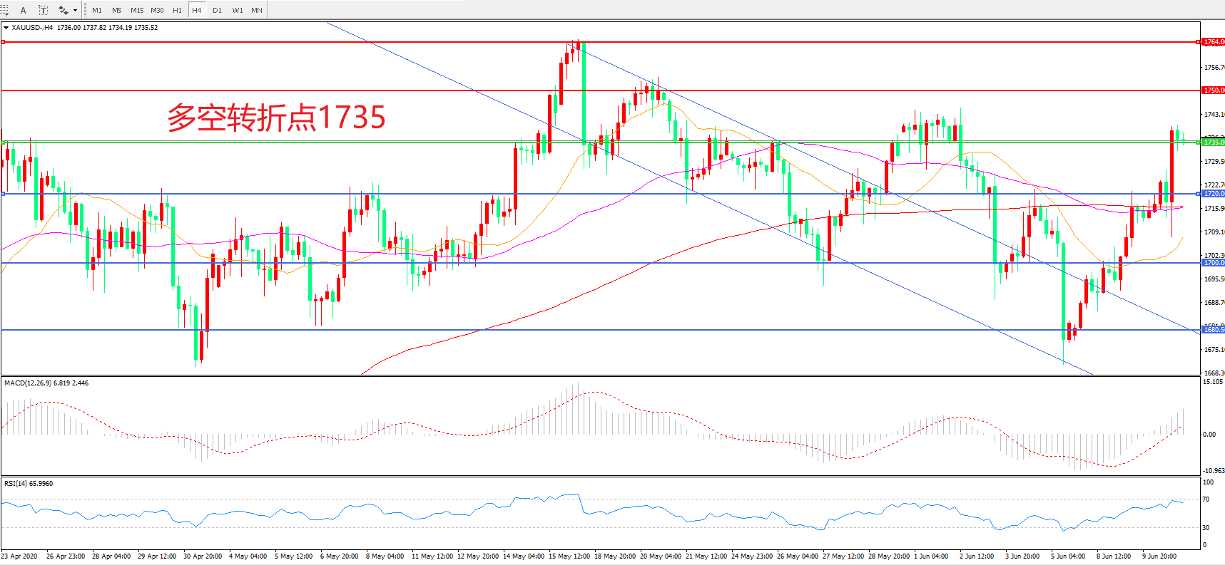 周三(6月10日),美联储如市场所料,维持基准利率不变,但根据点阵图显示,低利率可能会维持到2022年底,宽松不断加码恐提升了市场的通胀预期,也提振了黄金的对冲需求,现货黄金探底回升,大涨逾15美元,收报1735.23美元/盎司。