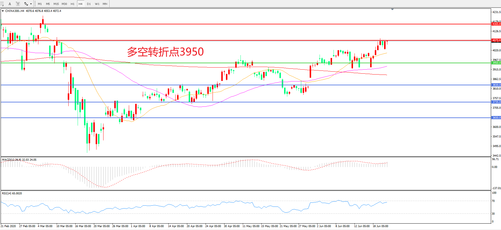 4小时图看,沪深300震荡上行, 4075一线成为多空争夺焦点,整体变现依然十分强势,21周期均线成为支撑, MACD红柱增加,RSI指标向上,日内延续震荡概率较大。