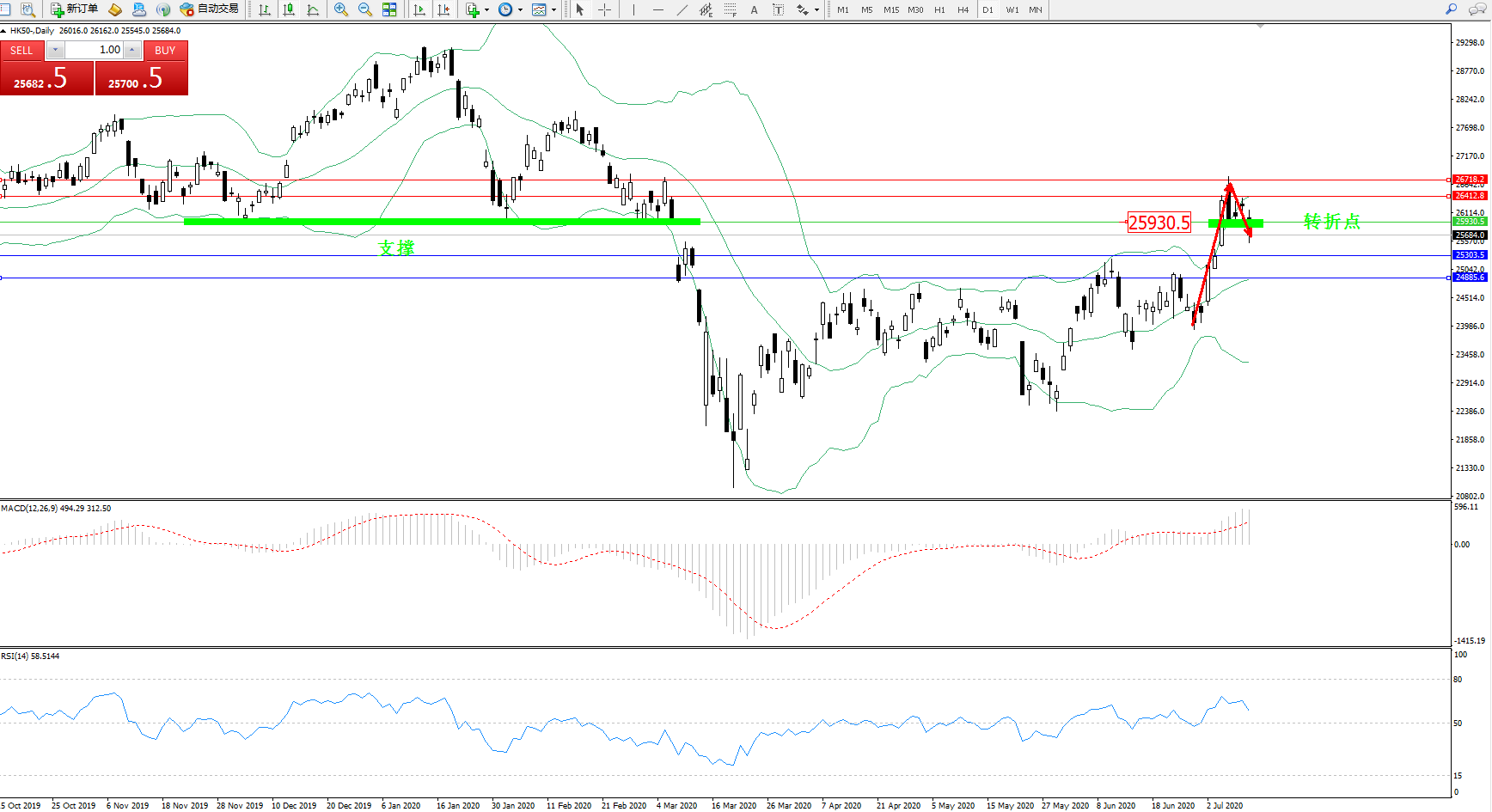 技术点评:多头动力延续布林带指标上轨强势拉升上扬后,高位遇阻开始维持宽幅震荡回撤下移,前期低位25930附近节点,现在转为关键转折点,上方压制相当强劲,短期内多头动力或有机会再度试探,但现在处于高位整理回撤走势,布林带指标呈张口走势后有开始收口迹象,MACD指标处于0轴线上方多头区域高位持续平移中,RSI指标处于多头区域拉升上扬后开始持续走平,有下移迹象;