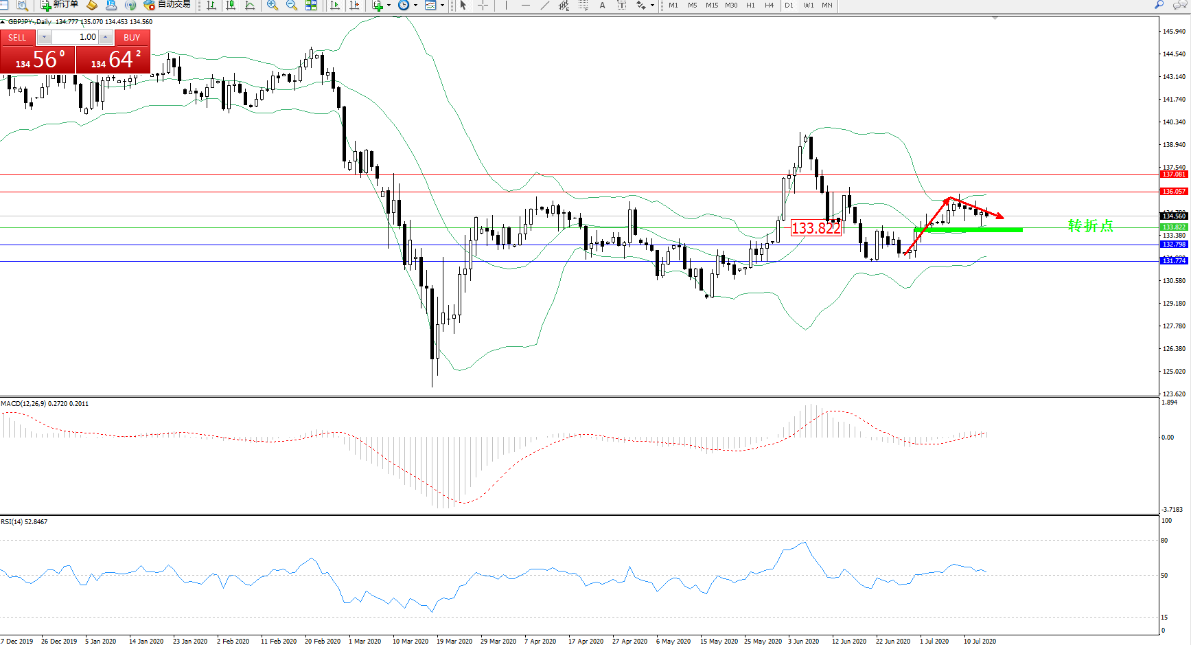 交易策略:133.822上方看涨,目标136.057137.081