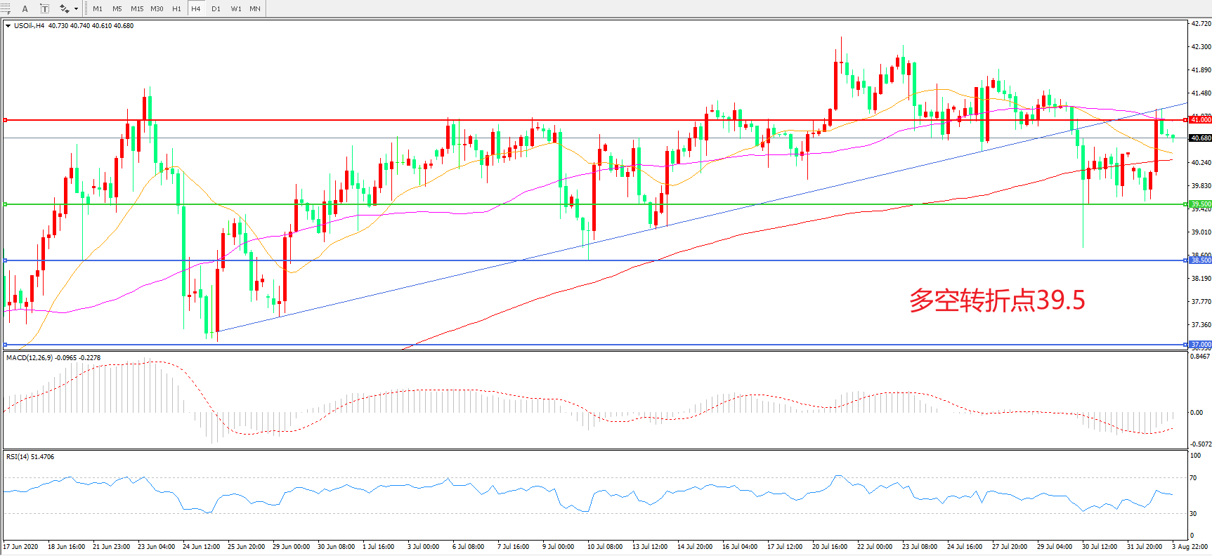 周一(8月3日),受各国经济数据利好提振,市场风险情绪回升,美国WTI原油自低位大幅拉升,收报40.67美元/桶。从8月1日开始,OPEC+的减产规模从970万桶/日缩小至770万桶/日,但沙特已表示将保持其8月份的原油出口水平和7月份大体相同,缓解了市场情绪的担忧。