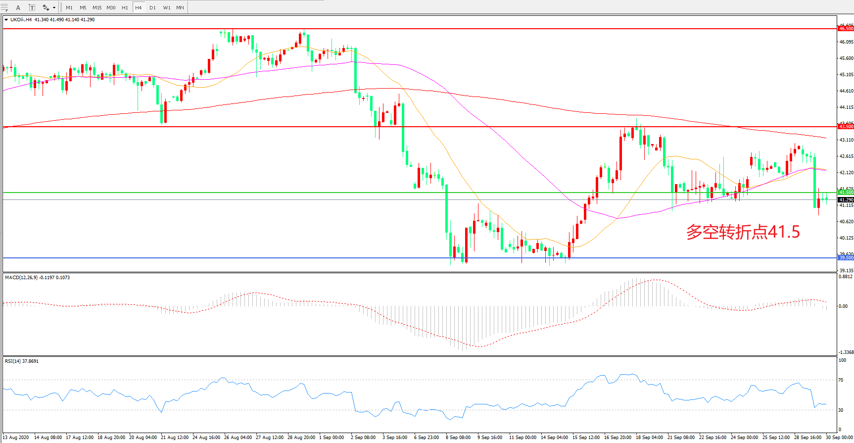 4小时图看,油价长阴下破,短期涨势受挫,41.5再次成为多空分水岭,均线系统走平,MACD绿柱增加,RSI指标走平,日内延续震荡概率较大。