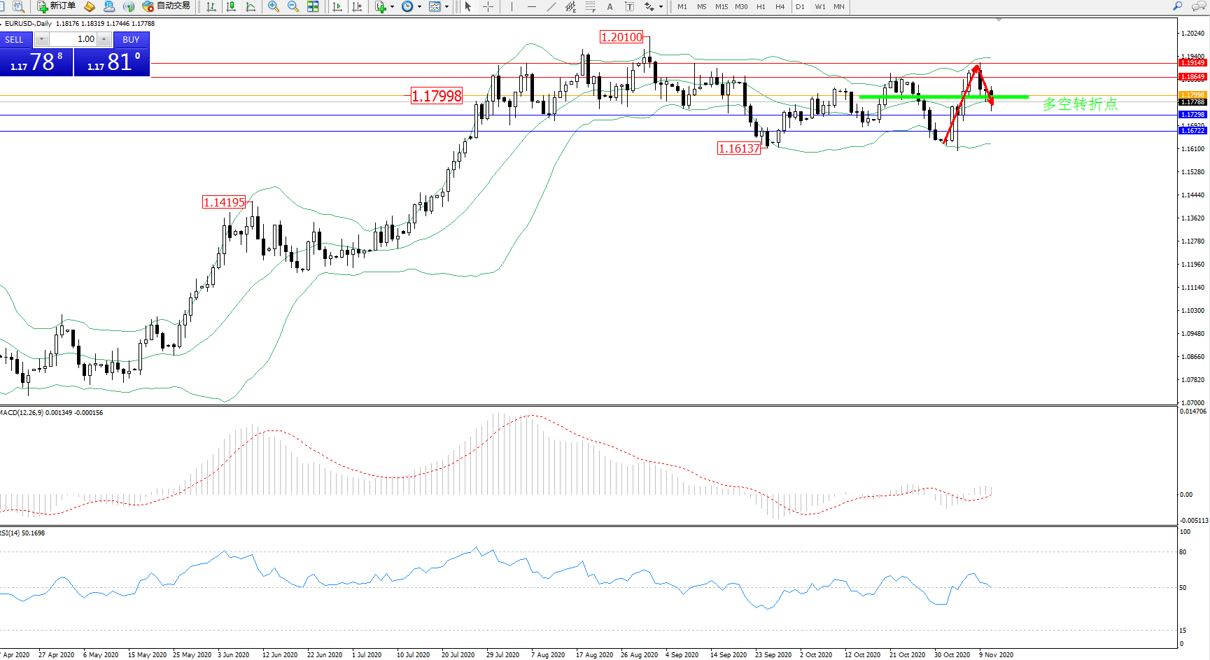 交易策略:1.17998上方看涨,目标1.18649、1.19149