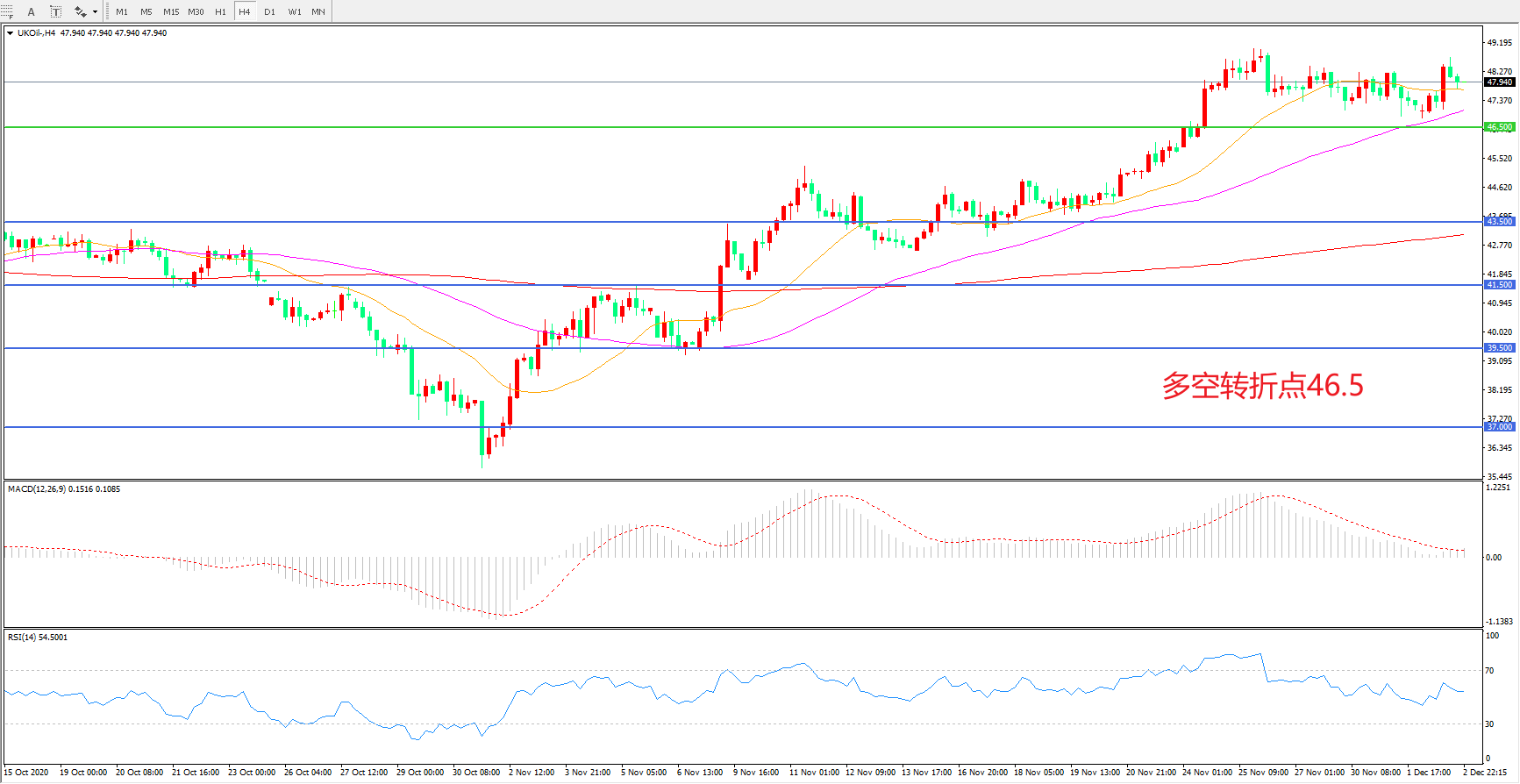 周三(12月2日),油价上涨受到新冠疫苗利好消息提振,以沙特和俄罗斯为首的 OPEC+联盟已经朝着达成新版石油产出协议取得进展,布伦特原油小幅冲高,尾盘回落后收报47.94美元/桶。目前市场对全球经济前景的预期相对乐观,同时对美国财政刺激政策的乐观预期也支撑了油价。根据昨晚公布的EIA数据显示,美国EIA原油库存减少67.9万桶,差于预期,库存升幅远超预期,且精炼油库存变化值录得11个星期以来的首次增长。数据公布后,布油曾短线快速走低,但在乐观情绪的支撑下,油价依然保持着相对强势。