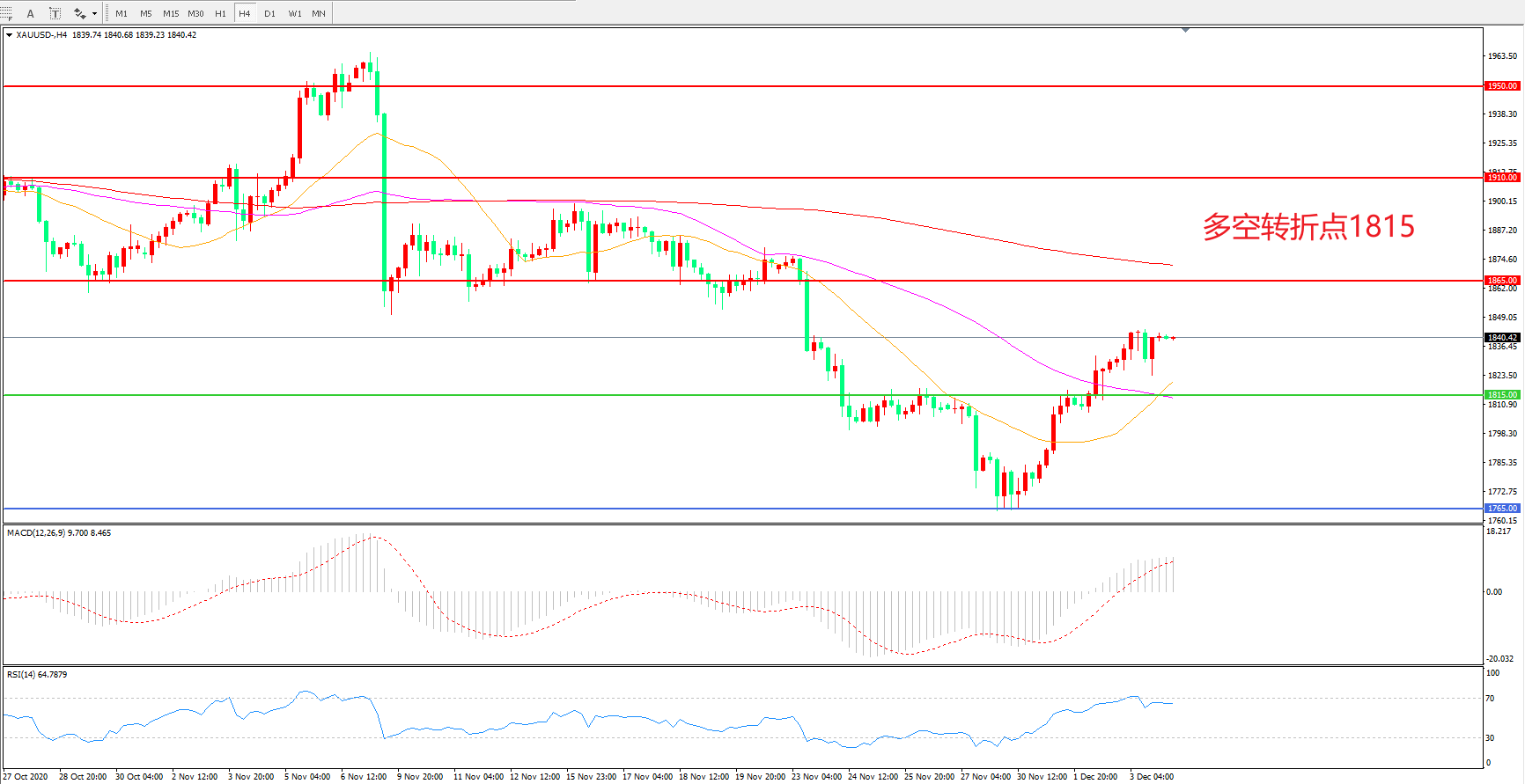 4小时图看,金价低位连续拉升,短期走势有所回暖,1815成为多空分水岭,21周期均线拐头,形成金叉,MACD红柱增加,RSI指标走平,日内震荡上行概率较大。
