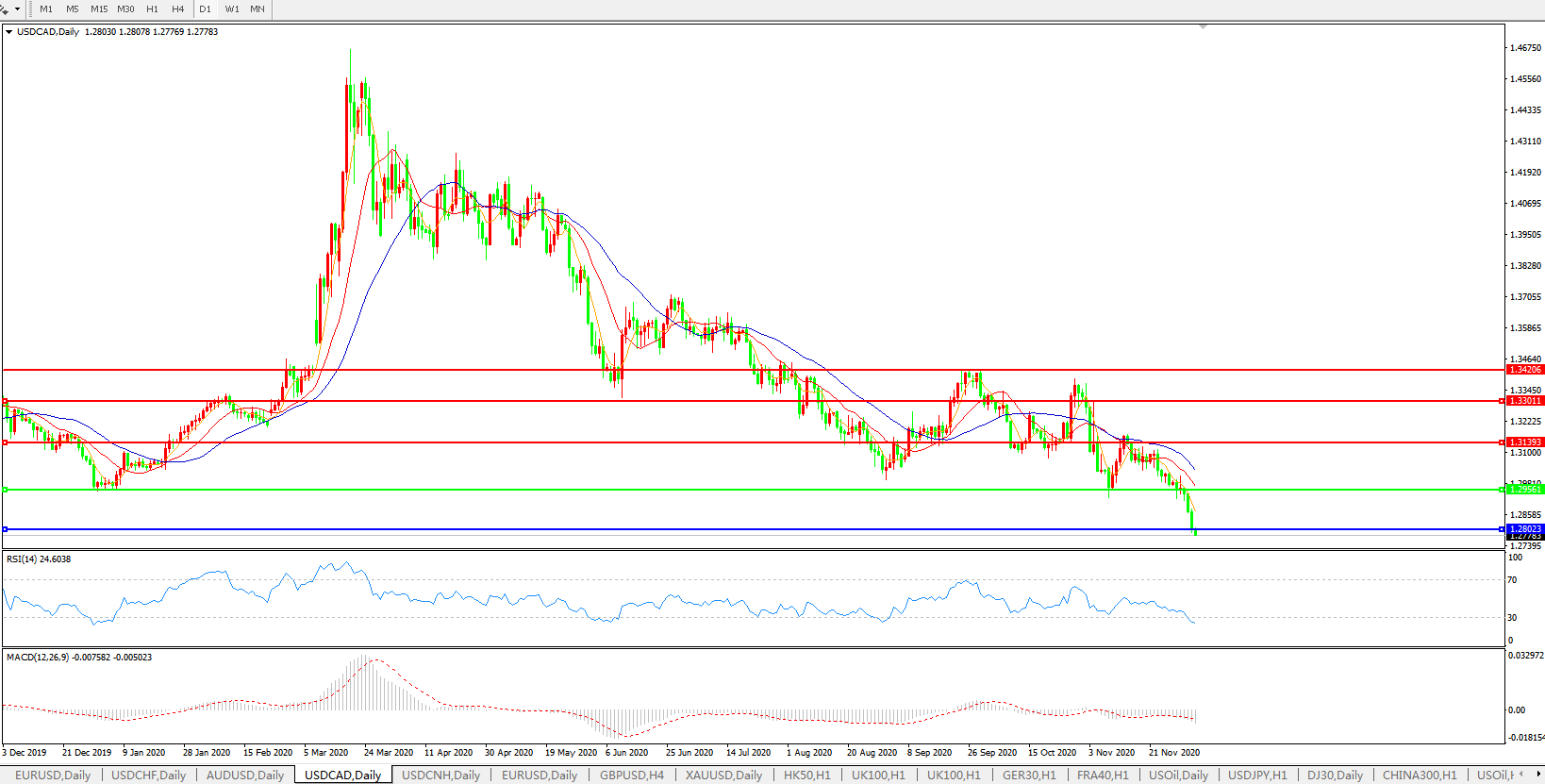 加元兑美元周五升至两年多来最高水平,早前发布的数据显示加拿大就业好于预期,而美国劳动力市场报告令人失望;加元跑赢G-10货币,因疲软的美国就业数据激发了人们对华盛顿出台更多财政刺激措施的希望,导致美元走低;美元兑加元一度跌0.64%,至1.2780,为2018年5月以来最低水平; 加拿大11月份增加就业62100人,大大高于接受彭博调查的经济学家预估的2万人;失业率降至8.5%,好于市场普遍预期的9%