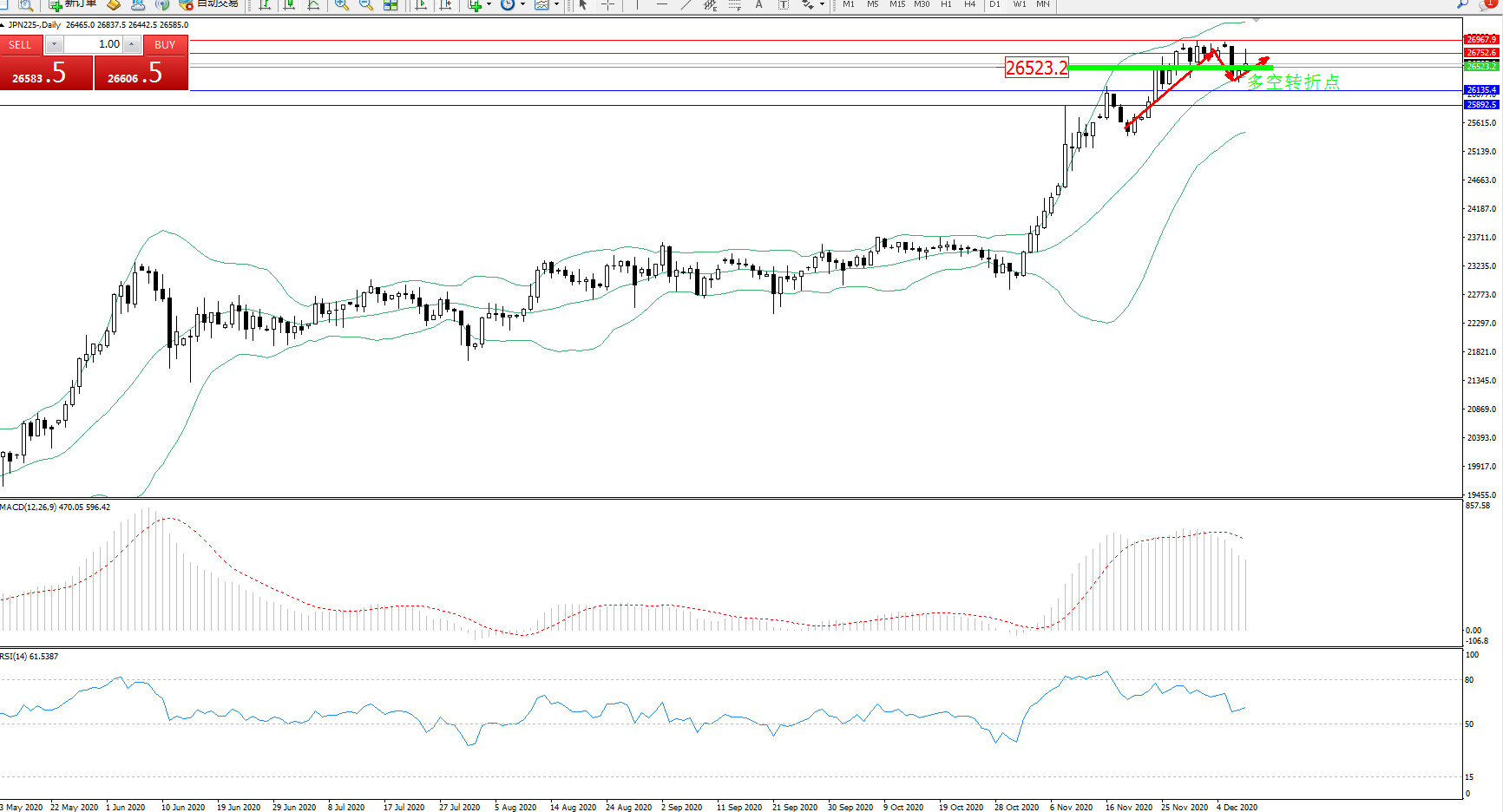 日经225指数12月9日(周三)收盘上涨329.92点,涨幅1.25%,报26797.00点。日本首相菅义伟在“零重力峰会”上发表了视频讲话,强调“希望同中国等近邻国构筑稳定关系”;就现阶段疫情,包括发展中国家,应确保疫苗公平供应,日本也将全力支持相关工作,治疗药、疫苗、诊断的研发和普及工作是不可或缺的。为应对不断扩散的疫情,国际社会应加强合作,实现“团结的世界”。日本新增新冠肺炎死亡病例47例,达单日最大增幅。截至8日,全日本共有536名重症患者,再现新高,给日本现阶段医疗体制带来紧迫的危机感;位于北海道的旭川市新增50名确诊病例,达最大增幅;旭川市内多家医院日前接连暴发集体感染,旭川厚生医院的确诊患者超过200人,为日本现阶段最大规模的集体感染。