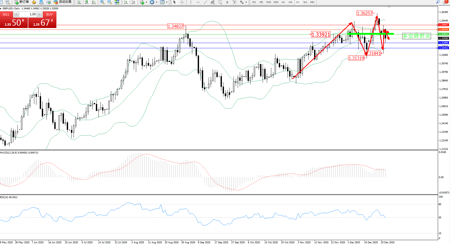 交易策略:1.33921下方看跌,目标1.32990、1.32411