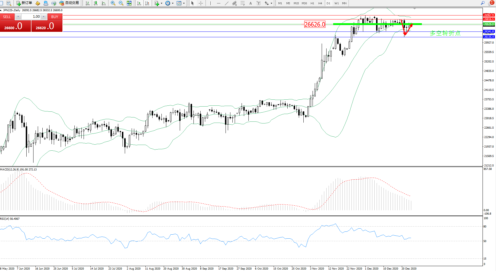 日经225指数12月24日(周四)收盘上涨138.21点,涨幅0.52%,报26663.00点。日本东京日新增888例新冠肺炎确诊病例,创纪录新高,累计确诊54018例。日本首相菅义伟:希望控制疫情,寻求建设绿色社会。将放宽对国际金融中心的签证规则。真正的竞争始于移动运营商之间。日本央行行长黑田东彦:日本经济可能会有适度改善的趋势。日本央行将评估有效、可持续的宽松货币政策。经济前景存在很高的不确定性,因为疫苗可能需要一段时间才能普及到大众。鉴于经济前景的不确定性,预计日本不会重返通货紧缩,但要谨慎观察价格走势。风险偏下行。在即将到来的政策审查中,不认为有必要改变收益率曲线控制。CPI目前可能会呈负值。日本央行将审查各种工具,包括审查收益率曲线控制(YCC)和资产购买是否发挥了预期的效果。