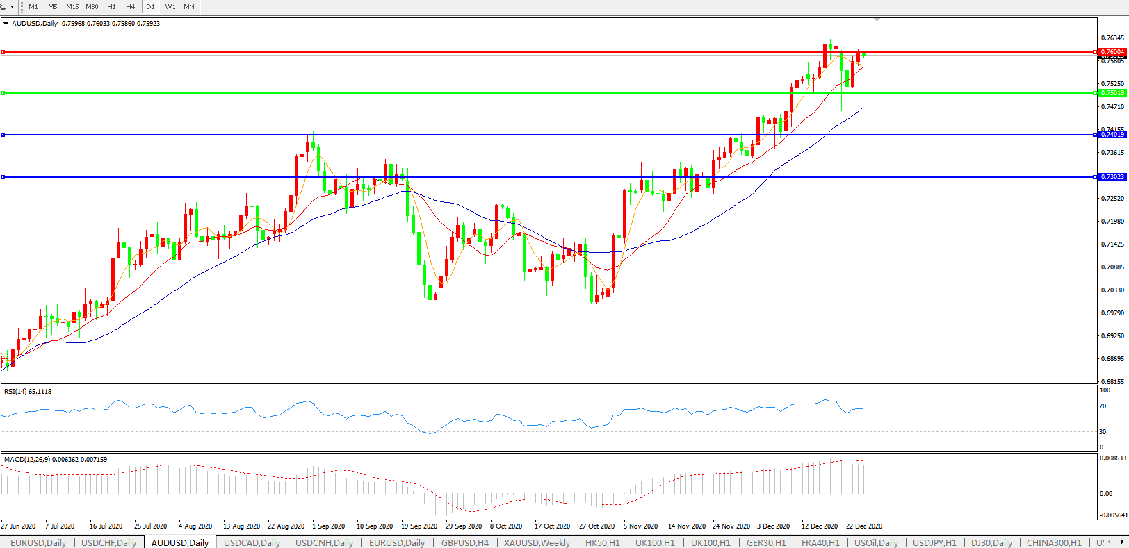 澳元兑美元上涨至0.7605,预期中的欧盟——英国贸易协议提振对风险敏感的澳元; 0.7605是三日高点,0.7606是周一高点 进一步阻力在0.7640,是上周创下的30个月高点。 交易员指出,近期的澳元涨势是受到大宗商品价格上涨推动,铁矿石期货经过两天下跌后反弹,铜价接近八年高点。