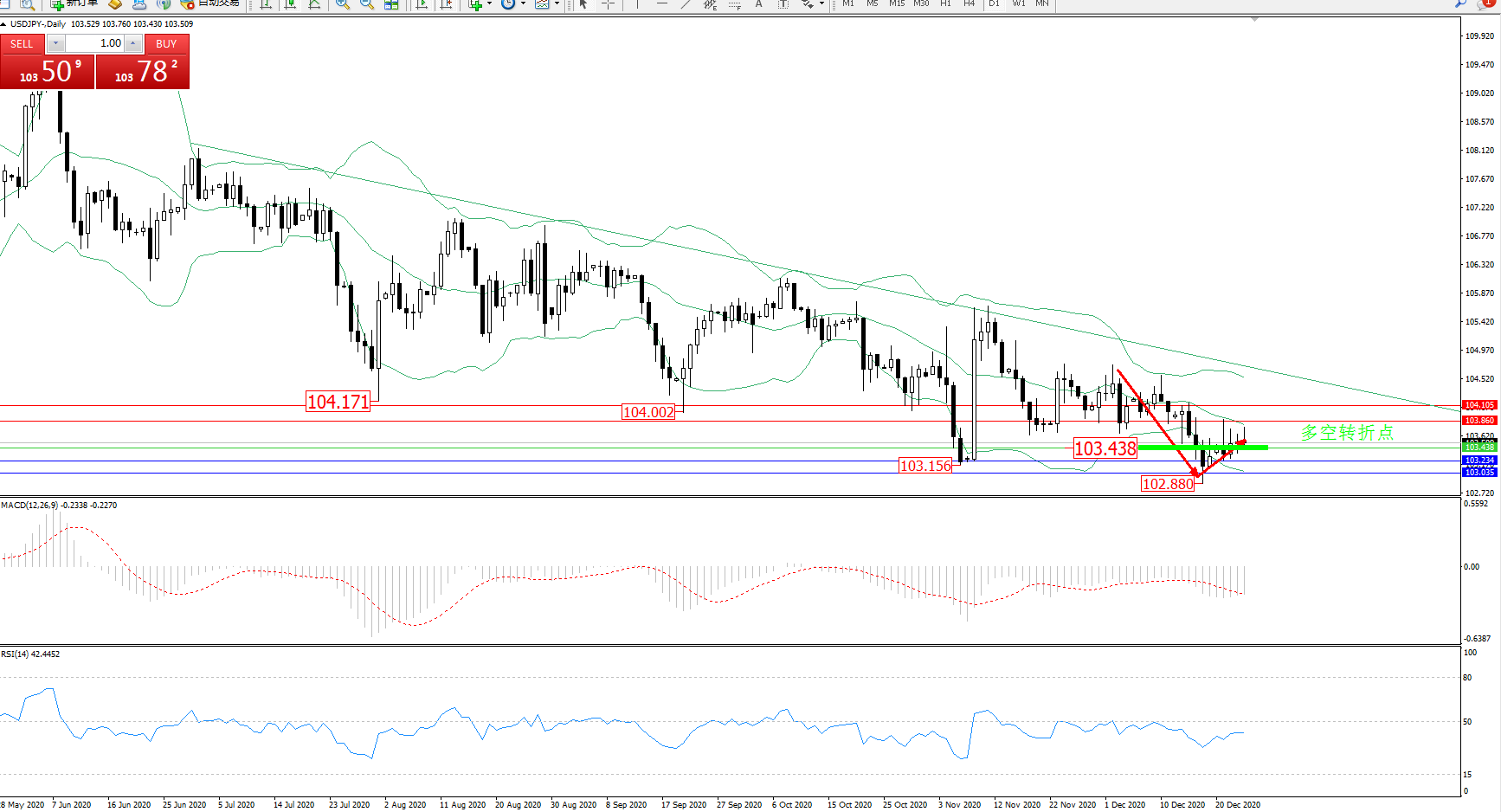 技术点评:空头动力延续布林带指标通道持续震荡下行后抵达102.880附近后得到支撑开始反转震荡上扬,处于中下轨区间弱势整理平移中,布林带指标呈张口走势持续后有收口迹象,MACD指标处于0轴线下方空头区域维持整理平移中,RSI指标处于50均衡线下方空头区域震荡后底部开始反转上移中;