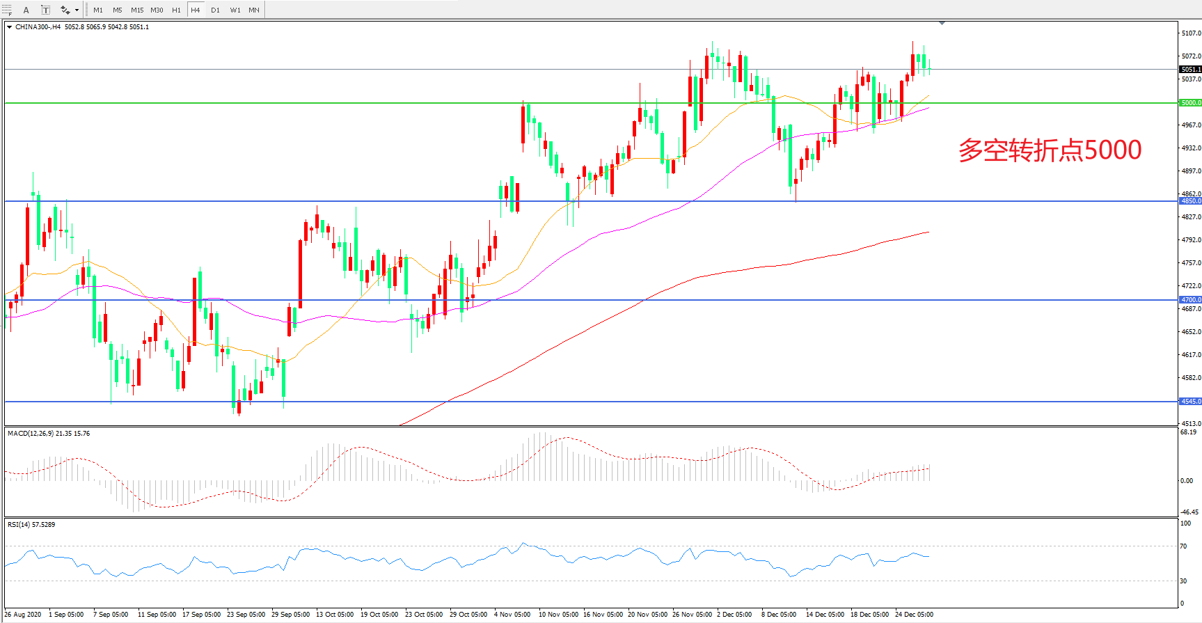 4小时图看,沪深300延续高位震荡,短期表现相对较强,5080成为短期阻力,MACD红柱增加,RSI指标向上,日内震荡上行概率较大。