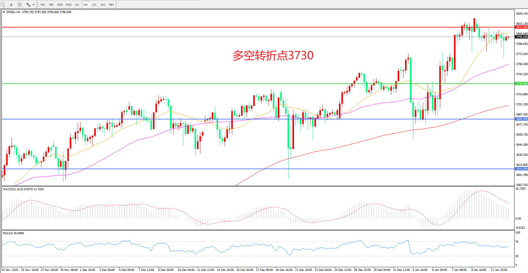 4小时图看,标普500延续高位震荡,短期涨势暂缓,3810成为短期阻力,但均线系统依然呈多头排列,MACD红柱减少,RSI指标走平,日内延续震荡概率较大。