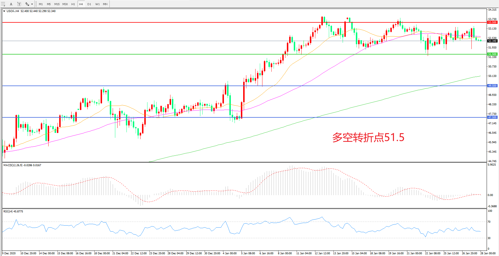 周三(1月27日),EIA数据原油库存大幅下滑接近1000万桶,比API数据更加乐观,油价一度大幅拉升,但美股暴跌引发了市场对风险资产的担忧,美国WTI原油震荡回落,收报52.33美元/桶。从价格的表现上来看,多头的动能似乎正在不断衰弱,但是空头上没有进入到发力的环节。因此,短期价格可能还会继续维持震荡走势