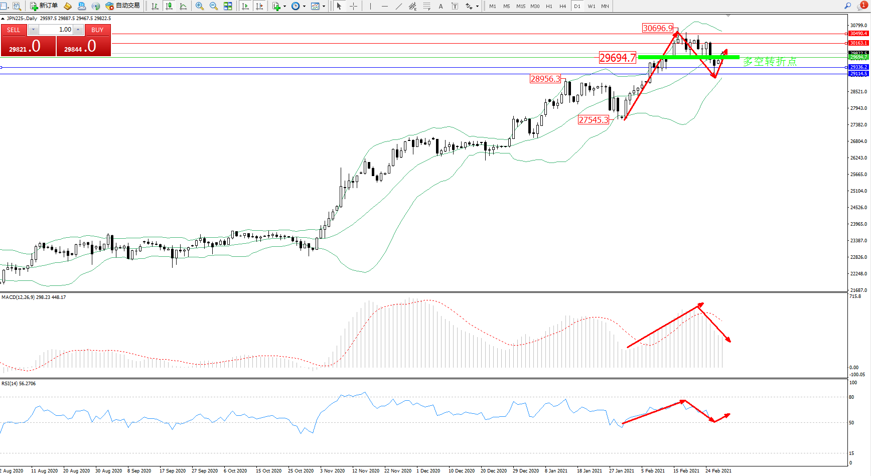 日经225指数3月1日(周一)收盘上涨711.49点,涨幅2.46%,报29677.50点。投资者此前所担心的美债收益率持续走高可能损害股市投资收益,并引发股市崩盘的风险,至少在当前来看仍是杞人忧天。当前美股投资回报率相对债市而言仍有着可观的优势,短期内股市不会遭受机构投资者的全面抛售;短期内将没有理由相信股市会因为潜在投资收益回报下降的原因而被大资金抛弃。亚洲股市自3月份以来最大幅度的下跌并未动摇他们的信心,建议买入该地区的周期性股票,因为预期经济将从疫情中强劲反弹。美国国会众议院27月通过总统拜登提出的1.9万亿美元新纾困法案;另外,上周曾升破1.6%创2020年2月以来新高的美国十年期国债收益率目前回落至近1.4%水平。有市场分析指,联储局或透过扭曲操作(Operation Twist)纾缓长期债息上升的压力。