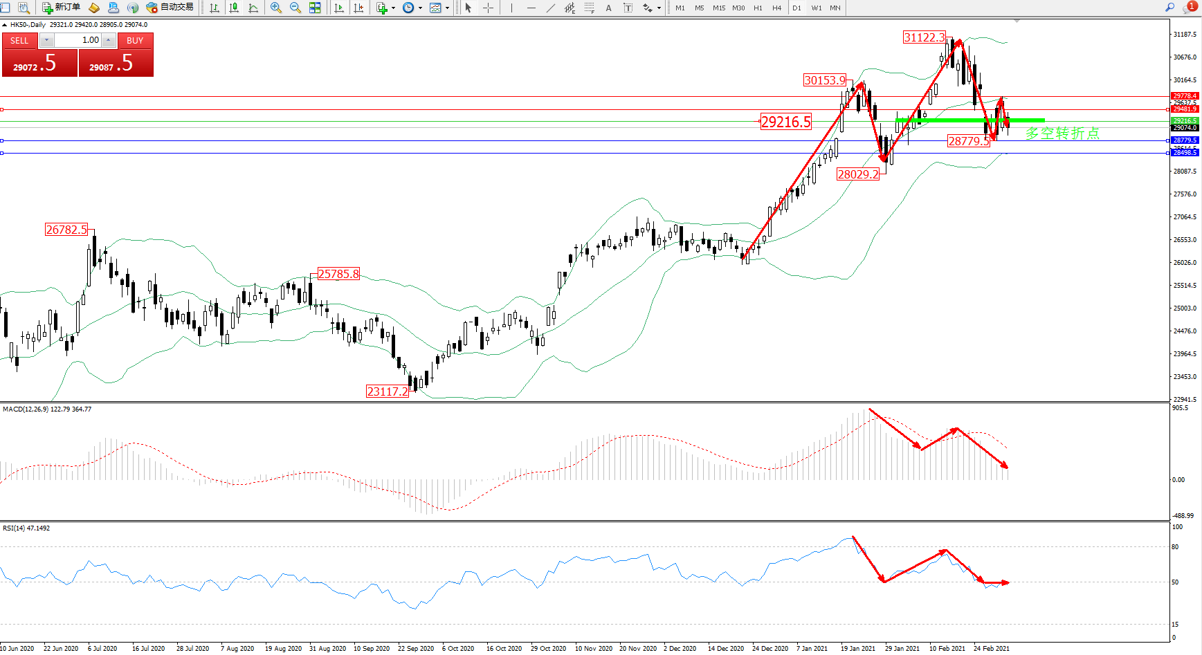 技术点评:多头动力延续布林带指标通道中上轨区间持续震荡上移至31122位置后遇阻回撤,纠结于布林带指标中下轨区间持续窄幅整理平移,低位抵达28779附近得到短暂支撑后开始缓慢回升,触及中轨附近节点后再度维持徘徊中,短期或将维持在中下轨区间弱势整理平移,布林带指标呈收口走势持续中,MACD指标处于多头区域维持震荡下行走势良好,RSI指标处于多头区域弱势震荡回撤至50均衡线附近持续徘徊中;