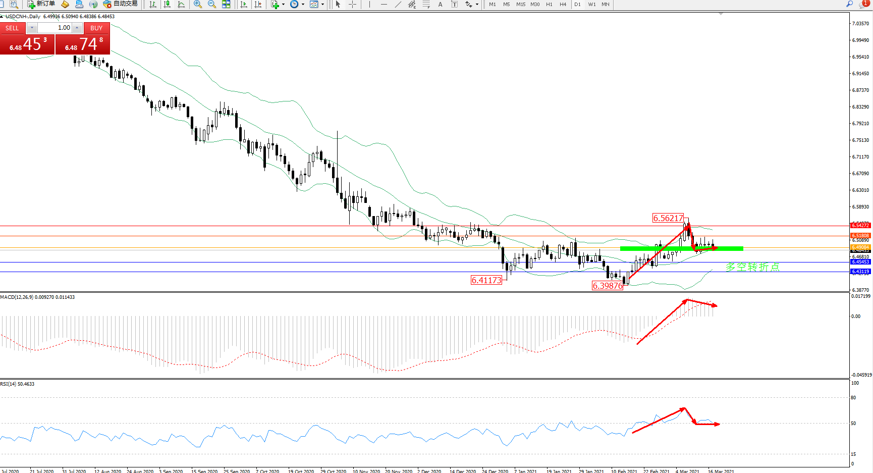 美元兑人民币维持6.48464附近整理,美联储将基准利率维持在0%-0.25%不变,符合市场预期;美联储主席鲍威尔表示,总体而言,金融环境仍然宽松,目前的货币政策是适当的,没有理由对过去一个月国债收益率的飙升予以反击。美联储目前的资产购买形式,即800亿美元的国债和400亿美元的抵押贷款支持证券,是合适的。经济前景改善,疫苗接种加速,以及1.9万亿美元的刺激计划使得美国国债收益率在过去一个月大幅上升。