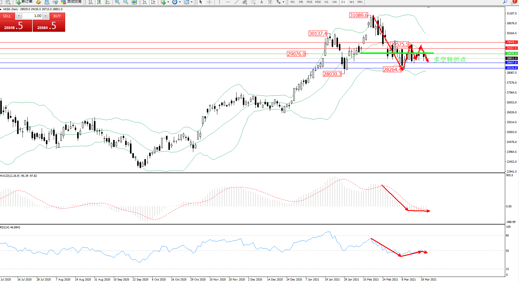技术点评:高位空头动力持续震荡下移后,低位抵达布林带指标下轨28264附近得到支撑开始反转震荡上移,触及布林带指标中轨附近节点后持续震荡中,布林带指标呈收口走势持续中,关注中轨附近节点,MACD指标处于0轴线下侧弱势整理,RSI指标处于50均衡线附近弱势徘徊中;