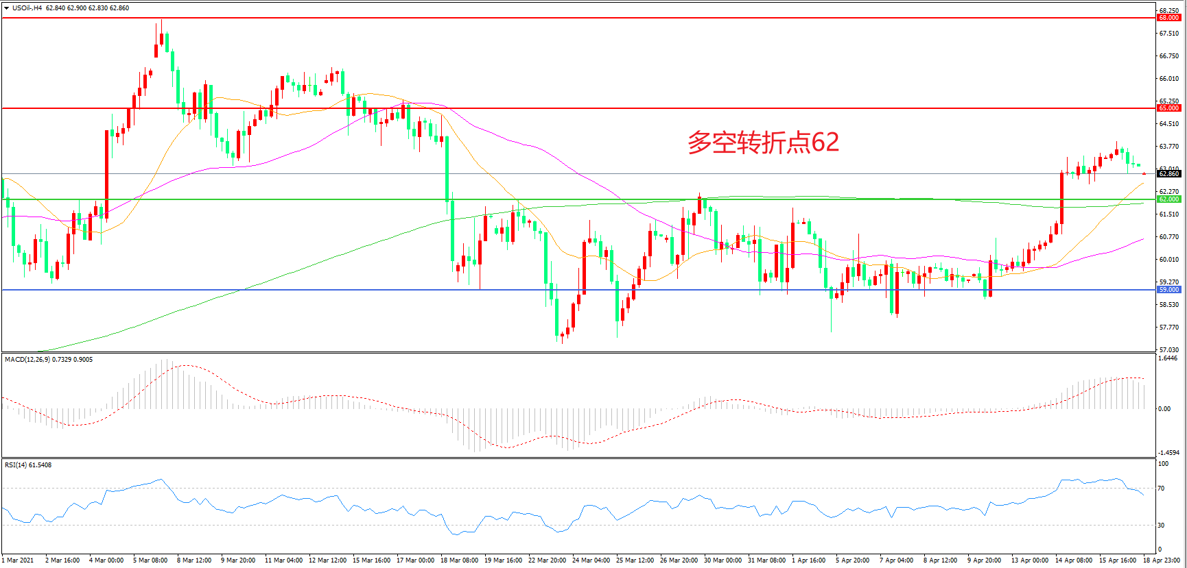 4小时图看,油价长阳拉升,突破前期整理区间,整体表现偏强,均线系统粘合形成下方支撑,62美元成为多空分水岭,MACD红柱增加,RSI指标走平,日内延续上行概率较大。