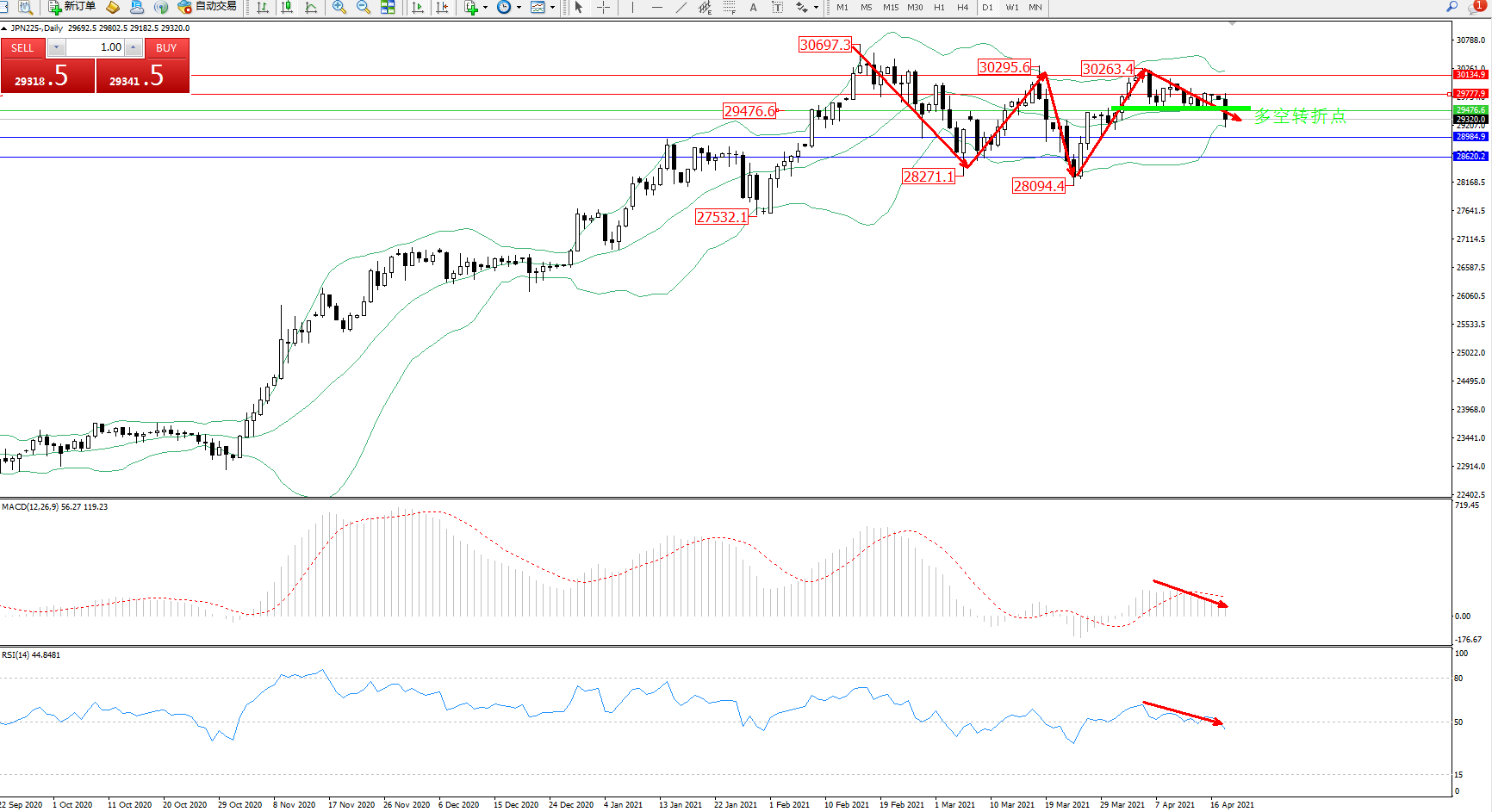 日经225指数4月19日(周一)收盘下跌12.37点,跌幅0.04%,报29671.00点。日本3月出口录得逾三年来最强增长,主要得益于对华出口激增,这一迹象表明,日本经济将继续从去年新冠疫情导致的严重衰退中复苏。但贸易数据不大可能完全缓解人们对日本经济复苏脆弱的担忧。2020年第一季,新冠疫情导致全球贸易崩溃,全球第三大经济体--日本经济遭受巨大打击。第一季出口反弹明显放缓,外部需求不大可能为今年的经济增长提供很大助力,出色的年增率数字是基期较低所致,因为2020年3月出口表现疲弱。日本3月对最大贸易伙伴--中国的出口同比大增37.2%,为1月以来最大升幅,其中有色金属和塑料出口领先,而半导体机械出口转强也带来帮助。3月进口同比上升5.7%,市场预估中值为增4.7%。该月贸易顺差为6637亿日元(61.1亿美元),预估中值为顺差4900亿日元。