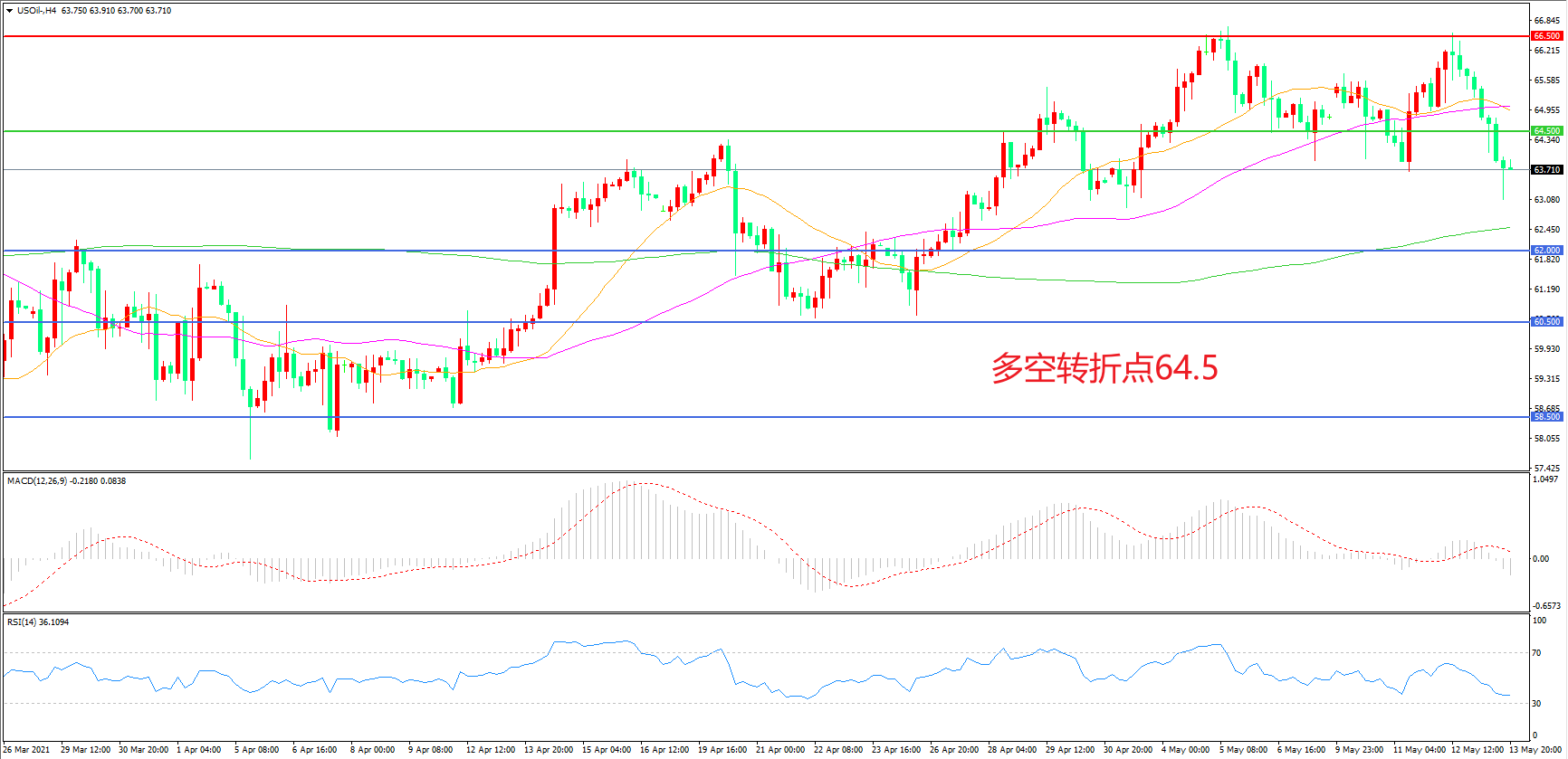 4小时图看,油价长阴连续下破,短期表现低迷,均线系统粘合成为上方阻力,64.5美元成为多空分水岭,MACD绿柱增加,RSI指标走平,日内震荡下行概率较大。
