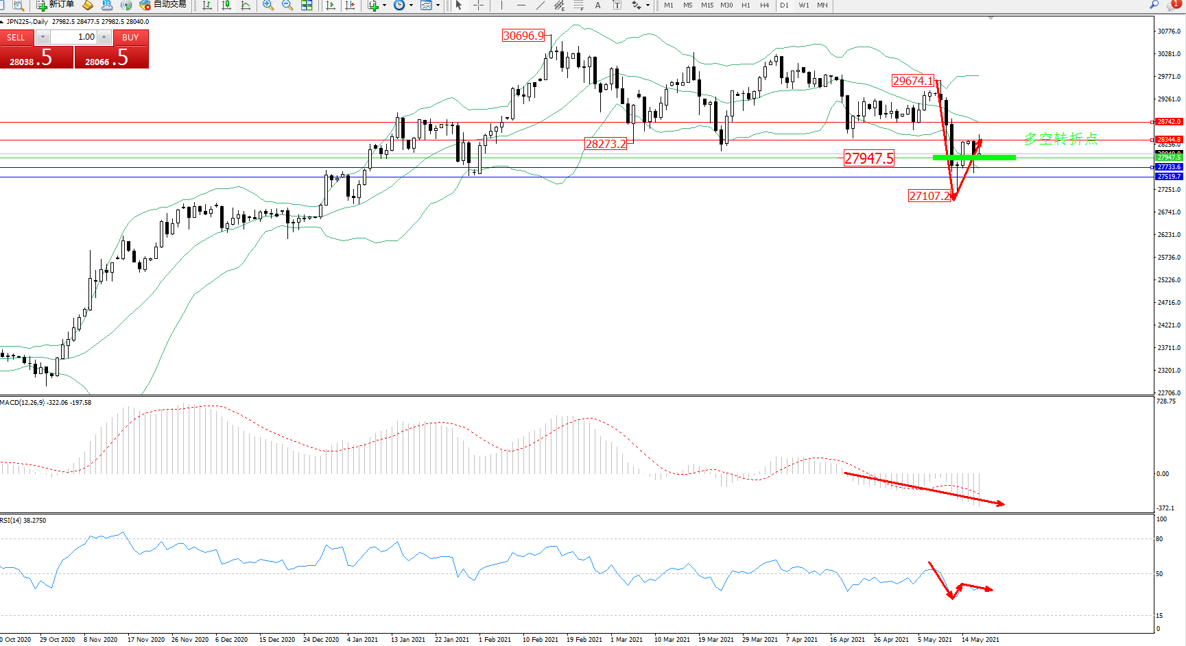 技术点评:空头动力急速下挫至27107位置后得到支撑反转上移,纠结于中下轨区间震荡,空头动力维持低位宽幅震荡走势中,布林带指标呈张口走势态势良好,关下轨内侧关键节点,MACD指标处于0轴线下方空头区域维持震荡持续下移,RSI指标处于50均衡线下方空头区域维持震荡平移中;