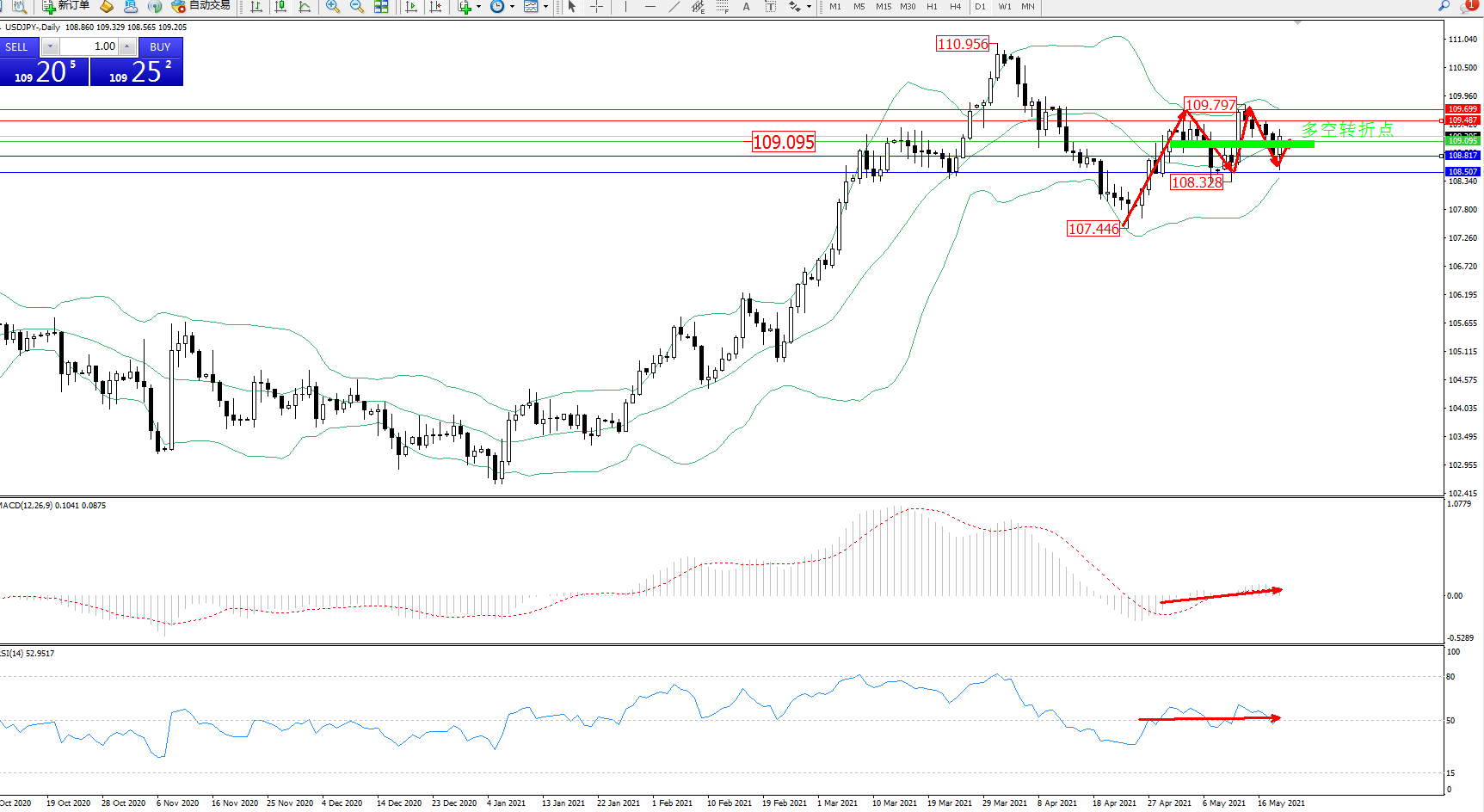 技术点评:低位多头动力持续震荡上扬,高位抵达布林带指标上轨附近109.797节点后遇阻回撤,跌破中轨后短暂回升,继续窄幅震荡中,布林带指标呈缓慢收口走势平移后有继续徘徊迹象,MACD指标处于0轴线附近弱势徘徊中,RSI指标处于50均衡线附近维持窄幅震荡;
