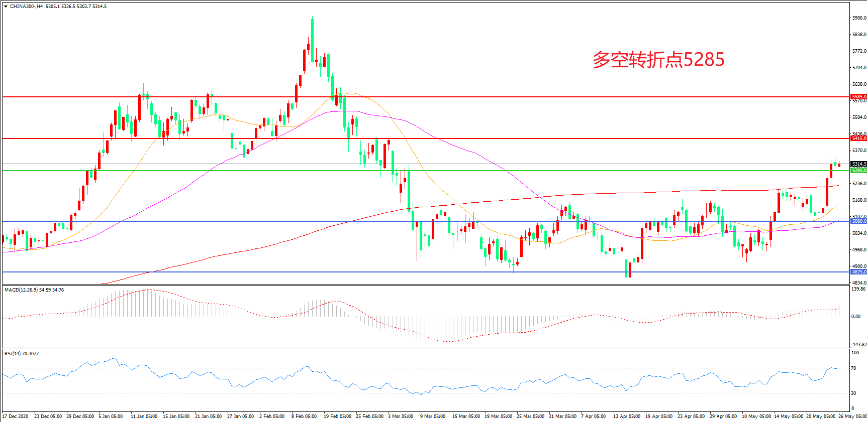 4小时图看,沪深300连续拉升后延续高位震荡,短线涨势暂缓,200周期均线成为下方支撑,MACD红柱增加,RSI指标走平,日内延续震荡概率较大。