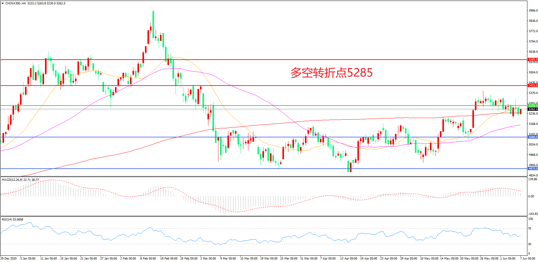 4小时图看,沪深300延续高位震荡,多空博弈较为均衡,5285成为多空分水岭,200周期均线成为下方支撑,MACD红柱缩短,RSI指标走平,日内延续震荡概率较大。
