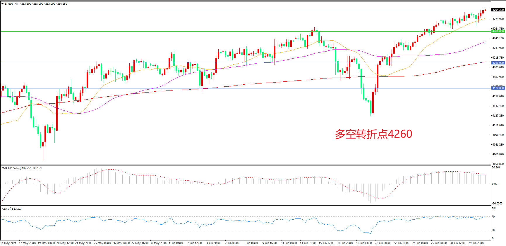 4小时图看,标普500阳线连续拉升,上行趋势较为明显,均线系统呈多头排列,MACD红柱增加,RSI指标走平,日内震荡上行概率较大。