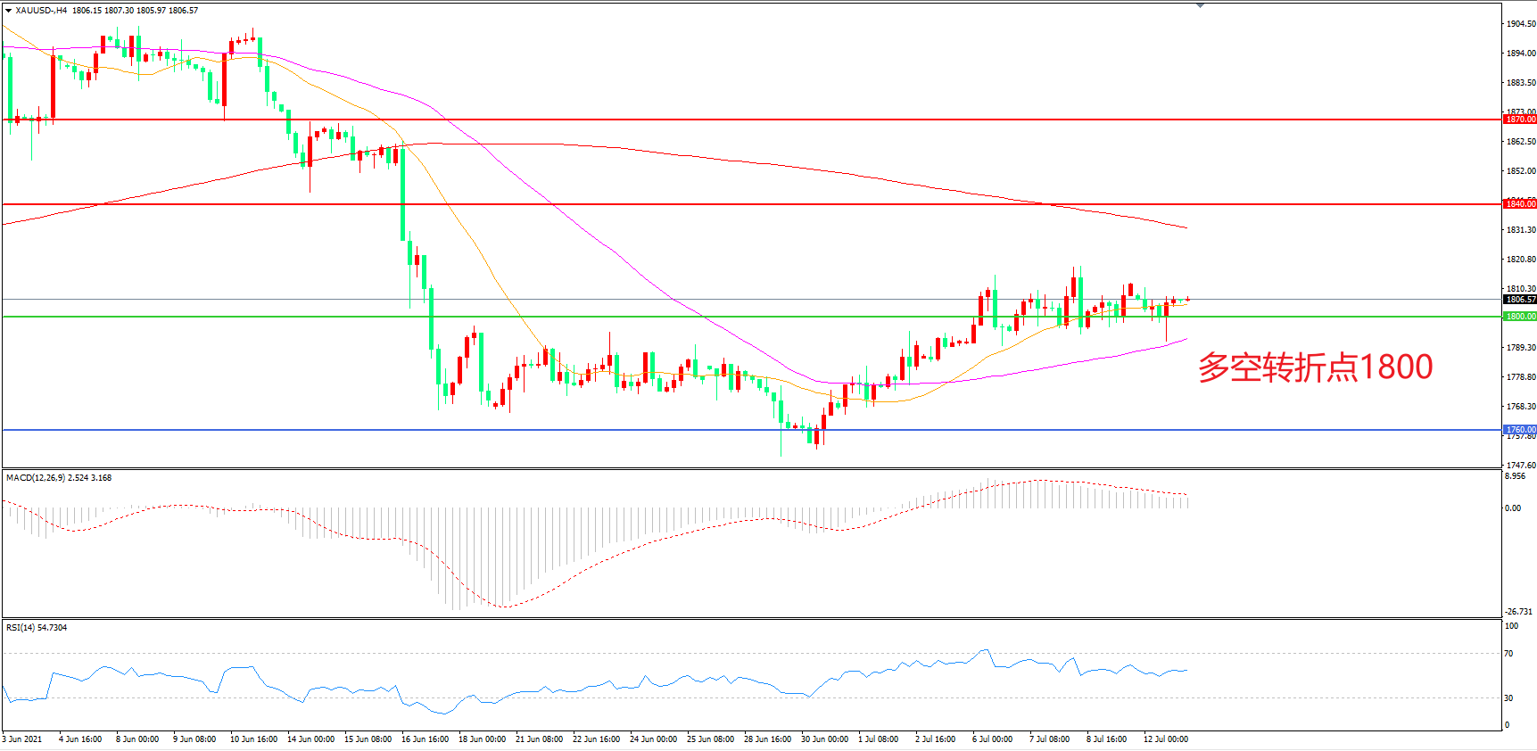 周一(7月12日),美元指数止跌反弹,多空双方在重磅事件来临前表现的异常谨慎,现货黄金延续窄幅震荡走势,收报1806.37美元/盎司。本周重磅事件密集来临,首先是美联储主席鲍威尔于国会作证,其从基本面方面周二和周三的关键通胀数据对市场有很大影响,此外投资者还在等待即将拉开的第二季财报季序幕,多重事件临近带来的冲击会放大市场波动,金价能否取得突破,在此一举。