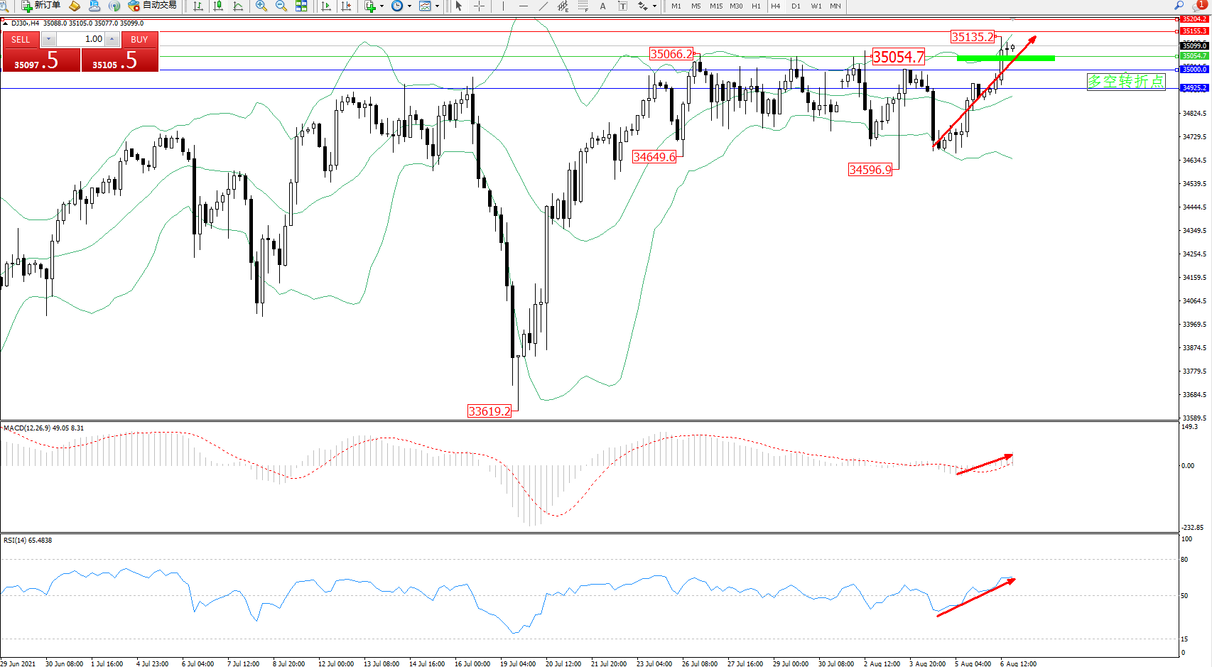 技术点评:长时间维持在高位布林带指标通道内宽幅震荡,多头动力终究迎来破位上行位置,布林带指标呈张口走势中,MACD指标纠结于0轴线附近整理后开始缓慢上移,RSI指标处于50均衡线上方不断震荡上扬;