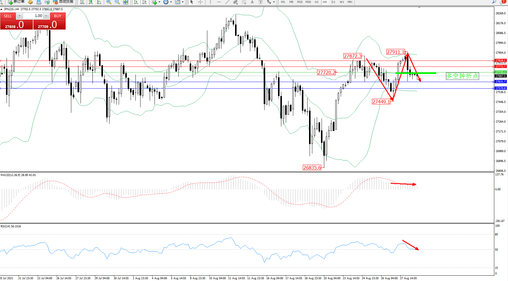 技术点评:高位维持在布林带指标通道内宽幅震荡平移,期间多次来回触及上下轨区间节点后震荡,纠结于中轨下方弱势震荡,短期或维持通道内整理,布林带指标持续平移中,MACD指标处于0轴线上方弱势徘徊,RSI指标处于50均衡线附近持续整理;