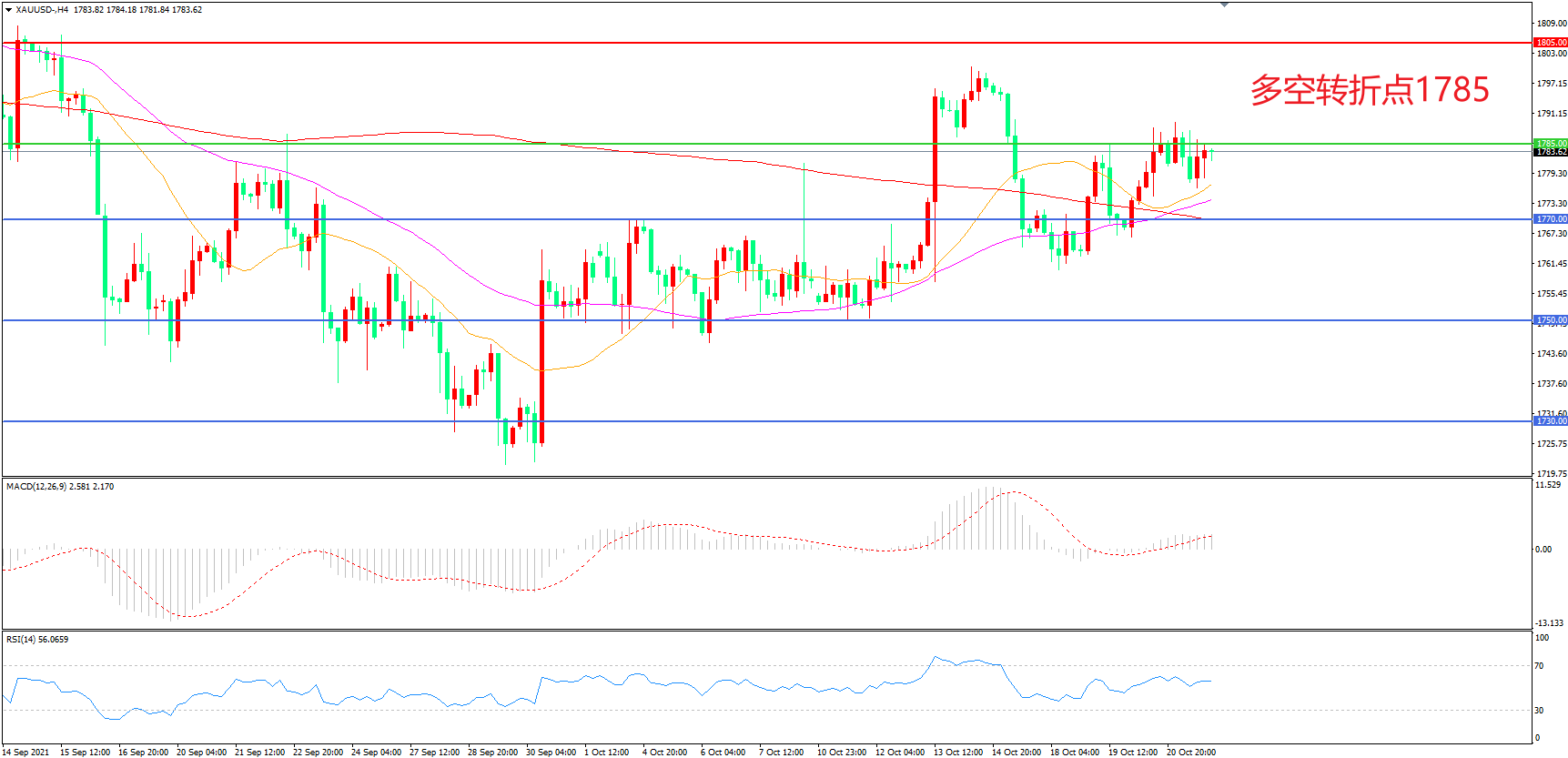 周四(10月21日),美国首次申请失业救济人数超预期下降,再创疫情爆发一年半来新低,,9月美国成屋销售户数创八个月新高,靓丽的数据表现推动美元指数回涨,现货黄金延续高位震荡,收报1782.98美元/盎司。亚特兰大联储主席行长博斯蒂克近期表示,他预计美国将在2022年晚些时候加息,同时他预计通胀压力将持续存在,美联储日趋鹰派的表态对金价上行形成明显制约。