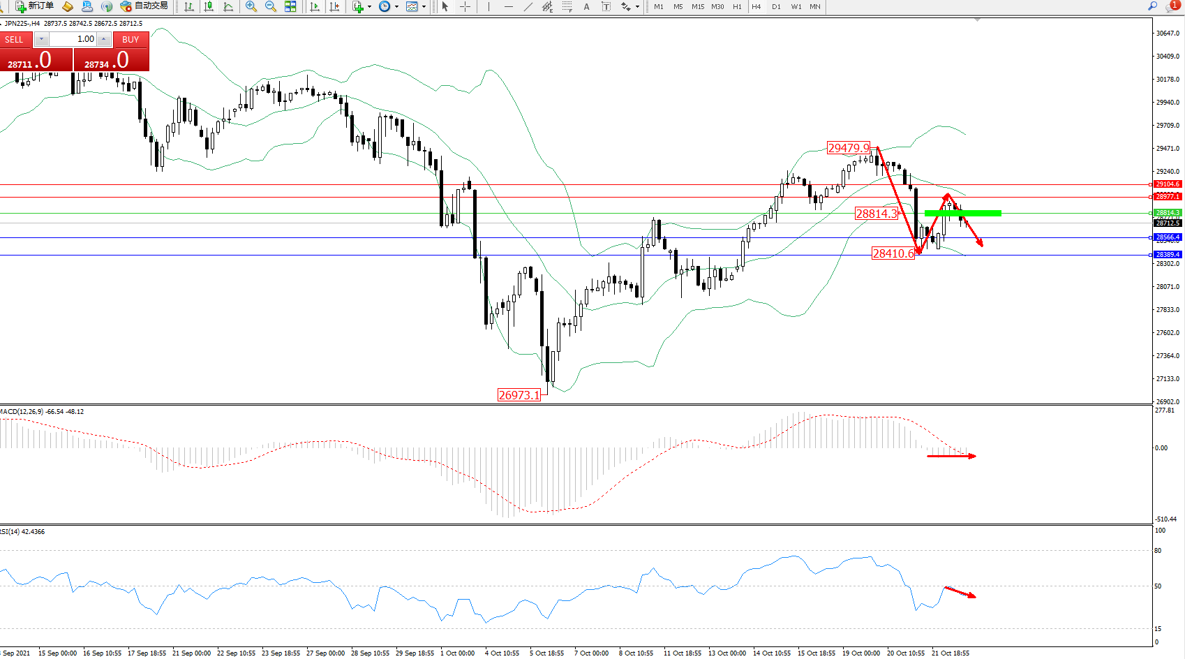 交易策略:28814下方看跌,目标28566、28389