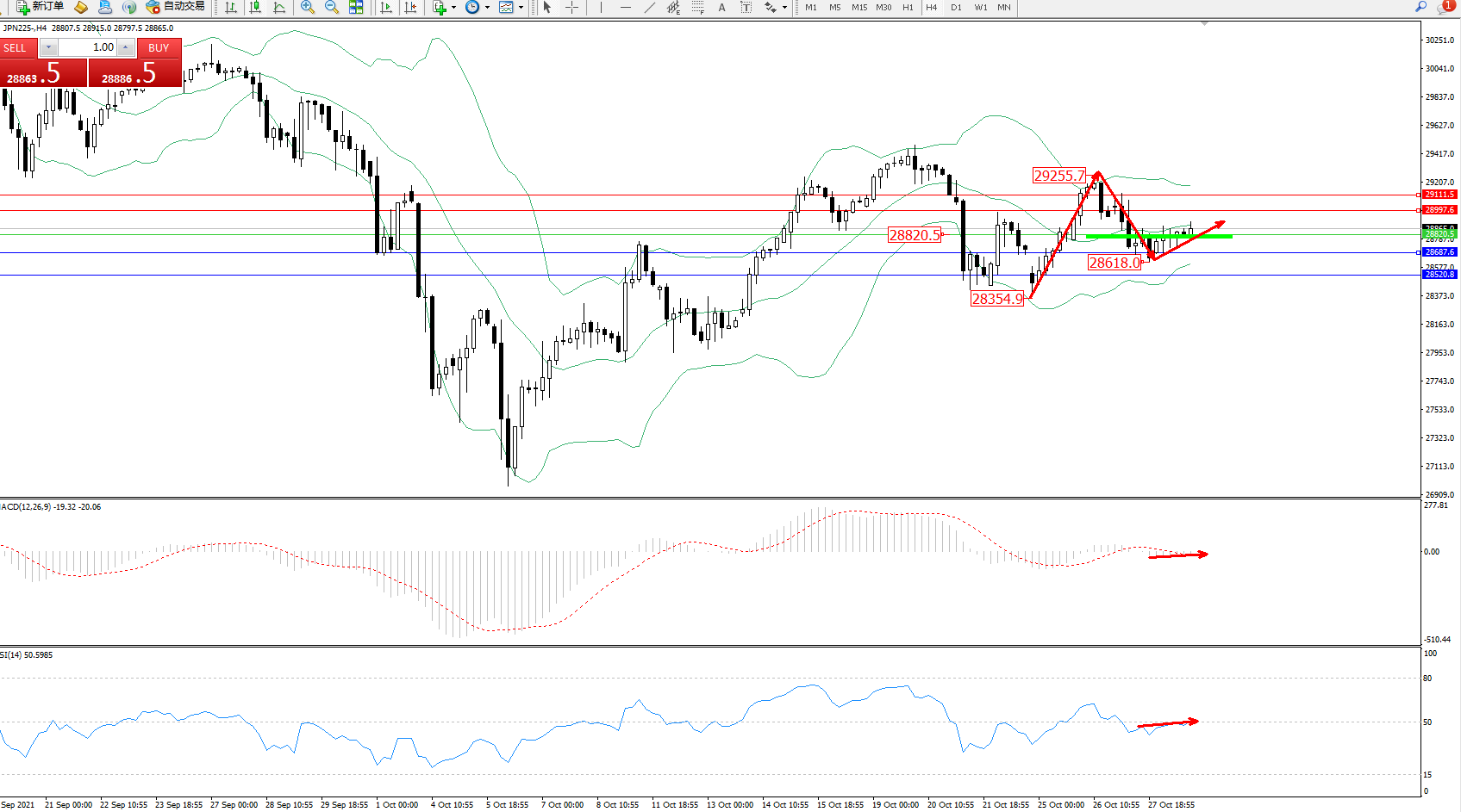 日经225指数10月28日(周四)收盘下跌279.24点,跌幅0.96%,报28819.00点。日本央行周四利率决议按兵不动,在全国大选将届之际发出经济复苏延迟的信号;虽然维持政策利率和资产购买计划不变,但它下调了对本财年经济增长的预测,以反映?新冠病毒病例在夏季激增和供应链问题带来的冲击。它还以供应受限为由下调了对出口和生产的看法。日本央行作出这项决定之际,正值外界呼吁政府支出以支持经济,日本也即将举行大选,选举的核心议题是收入不平等。尽管岸田的执政联盟可能会在周日的选举中维持优势,但如果选举结果不尽理想,可能会给这位新首相增加压力,得扩大他承诺的刺激计划之规模。