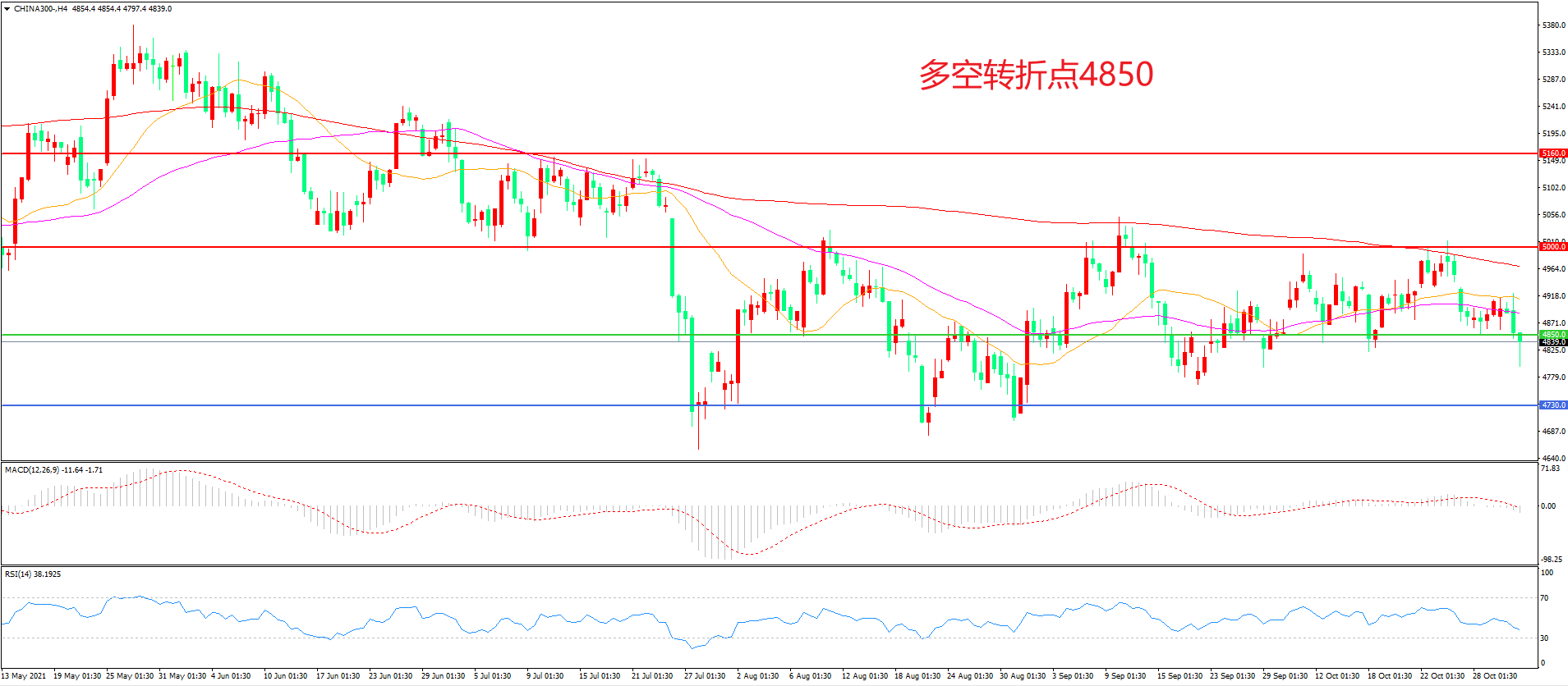 4小时图看,沪深300长阴下破 ,跌破前期整理区间,4850成为短期多空分水岭,均线系统成为上方阻力,MACD绿柱增加,RSI指标向下,日内震荡下行概率较大。
