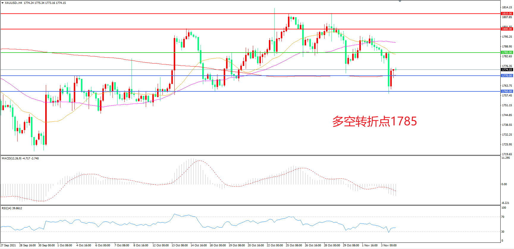 周三(11月3日),美联储如期Taper,宣布每月少买150亿美元债券,金价一度小幅回升,但有“小非农”之称的ADP就业数据显示,10月美国新增就业人口数为57.1万,远远超过市场预期,金价承压下破,收报1773.40美元/盎司。ADP数据对周五公布的非农就业数据具有前瞻性,两数据具有高度相关性,如果周五非农延续强势表现,金价或将再度下行。