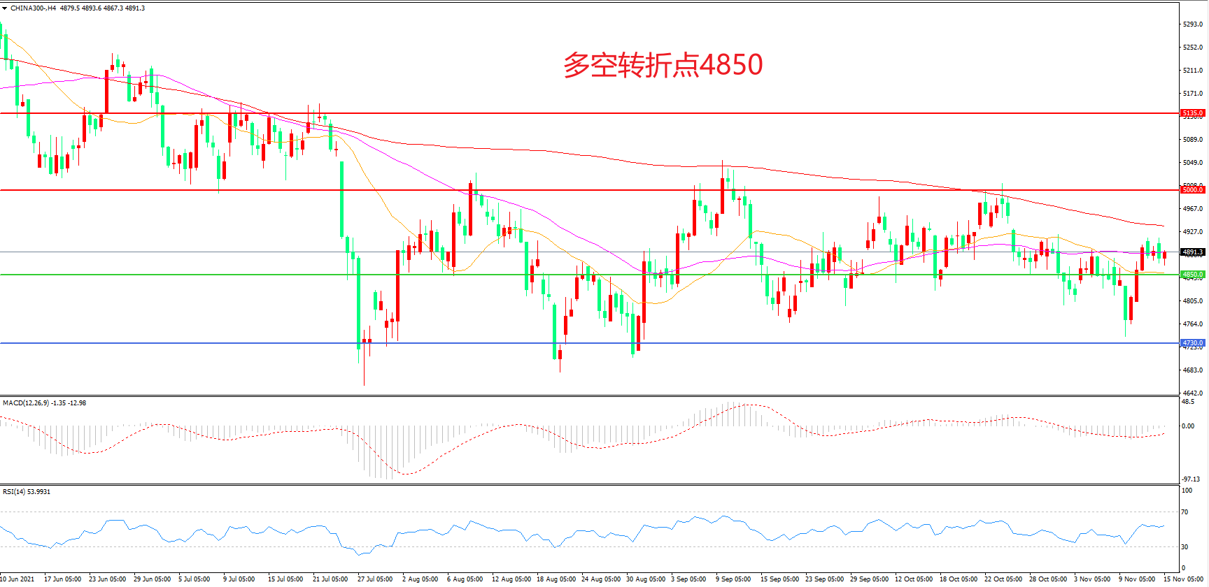 4小时图看,沪深300突破4850之后延续窄幅震荡,短期走势有所回暖,但200均线依然成为上方阻力,4850成为多空分水岭,MACD绿柱缩短,RSI指标走平,日内延续震荡概率较大。