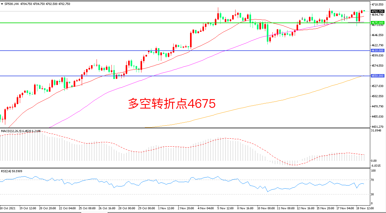 周四(11月18日),传出计划2025年推出全自动驾驶汽车消息的苹果等多数蓝筹科技股继续走高,科技股所在的板块强势推动标普500大幅反弹,收报4704.75点。最新数据显示,美国10月份消费者价格飙升6.2%,创下1990年11月以来最高点,飙升的谁引发了市场对供应链和通胀担忧,目前越来越多投资者预计美联储将比预期更早加息,多空双方将在巨大分歧中持续博弈。
