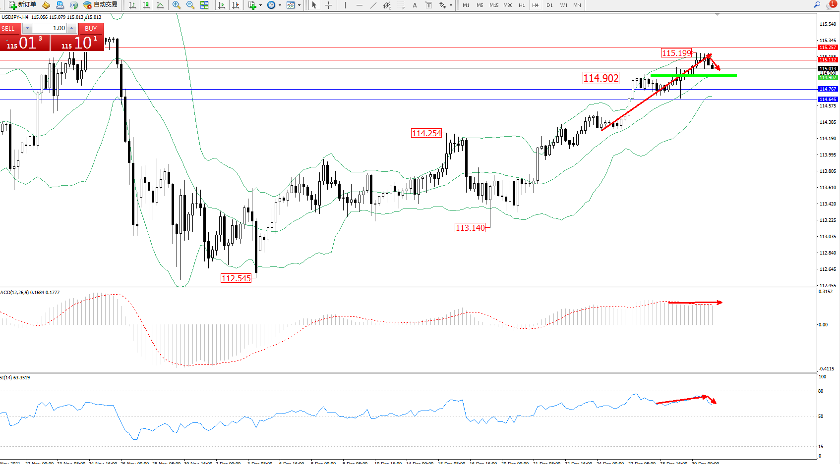 技术点评:多头动力延续布林带指标通道中上轨区间持续震荡上扬,高位抵达115.199位置得到压制,开始震荡回撤,空头动力有伺机入场迹象,但整体上扬走势态势良好,多头动力依旧有拉升态势,布林带指标呈上行趋势走势持续,高位开始有短暂收口迹象,MACD指标处于多头区域维持整理平移,RSI指标处于多头区域维持震荡上移后开始回撤;