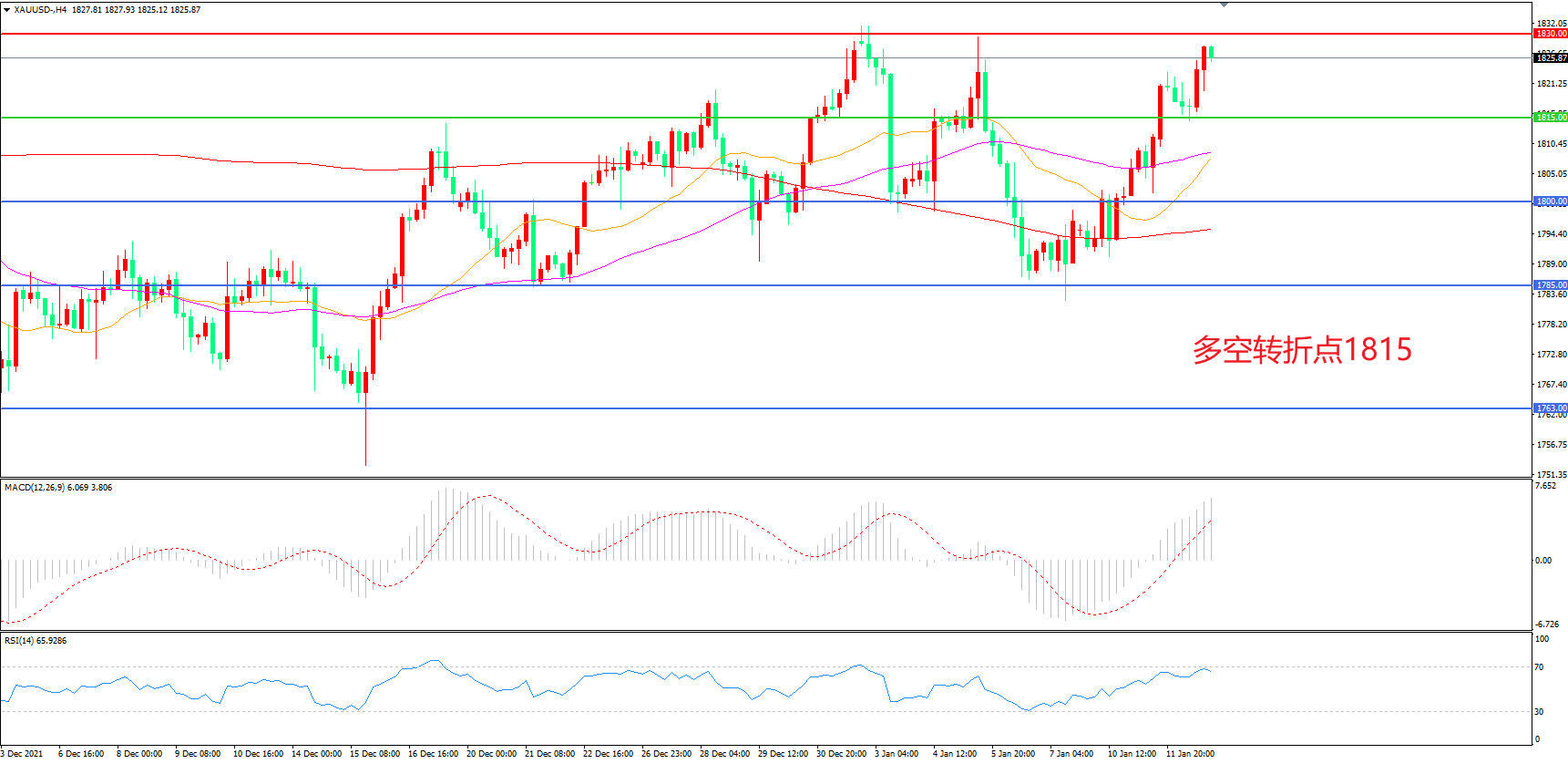 4小时图看,金价突破1815阻力关口后连续拉升,短期走势偏强,均线系统有金叉迹象,MACD红柱增加,RSI指标走平,日内震荡上行概率较大。