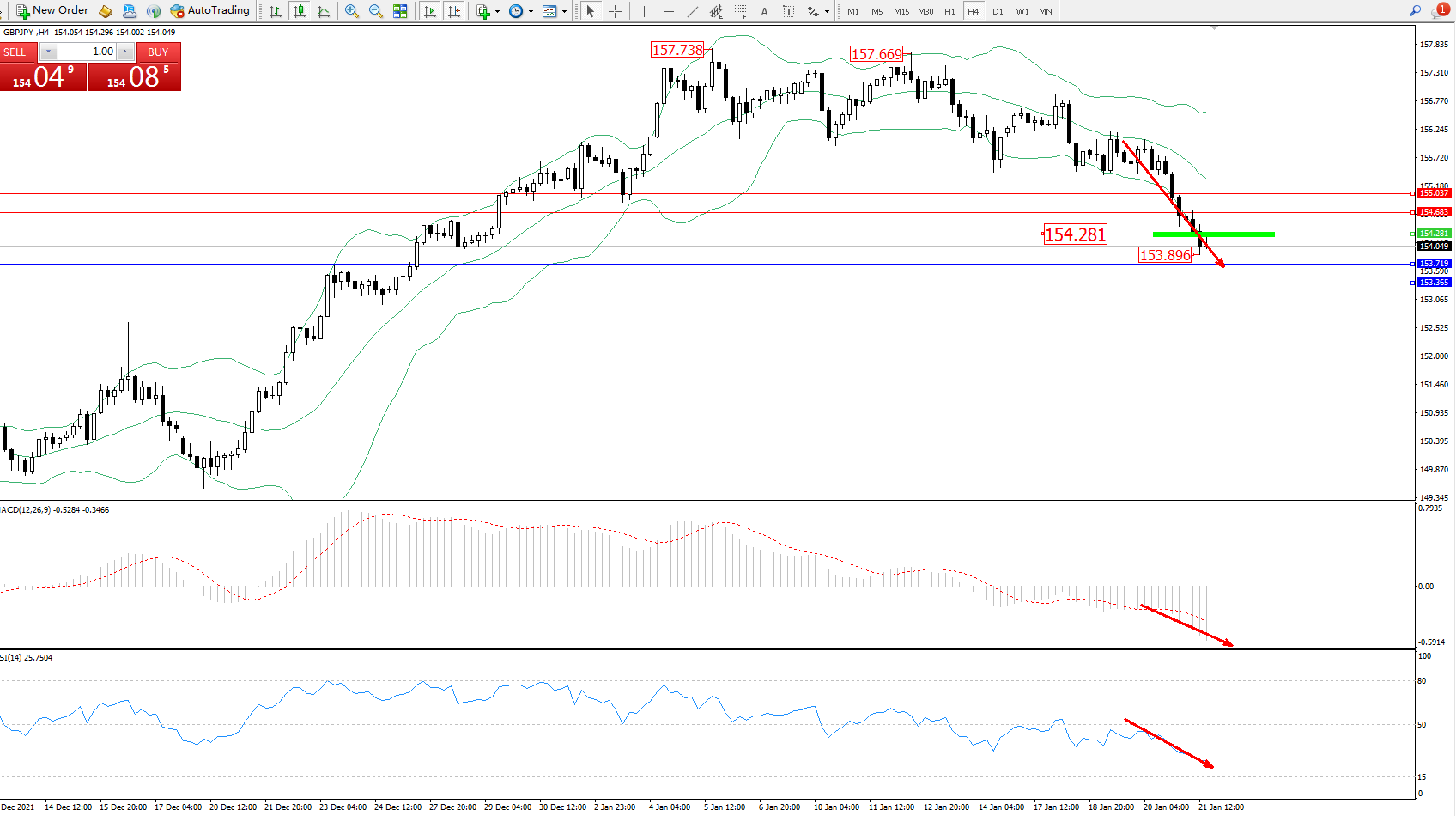 技术点评:空头动力延续布林带指标下轨附近持续震荡下行,低位抵达153.896位置短暂震荡后有继续下行态势,布林带指标呈缓慢张口走势持续中,MACD指标处于空头区域维持震荡下行,RSI指标处于空头区域维持震荡不断下行中;
