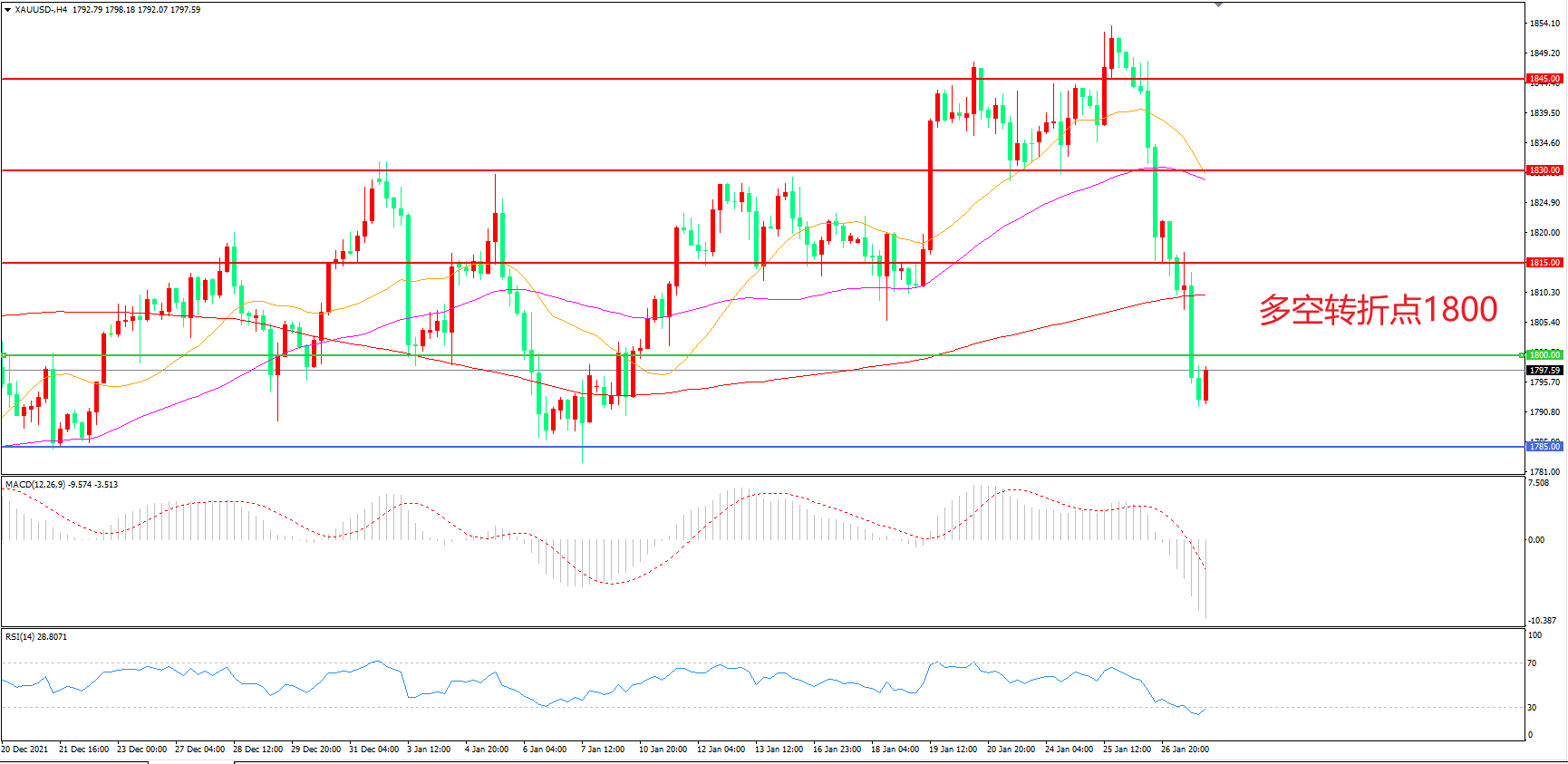 4小时图看,金价长阴连续破位,短期走势偏空,1800关口被跌破,MACD绿柱增加,RSI指标走平,日内震荡下行概率较大。