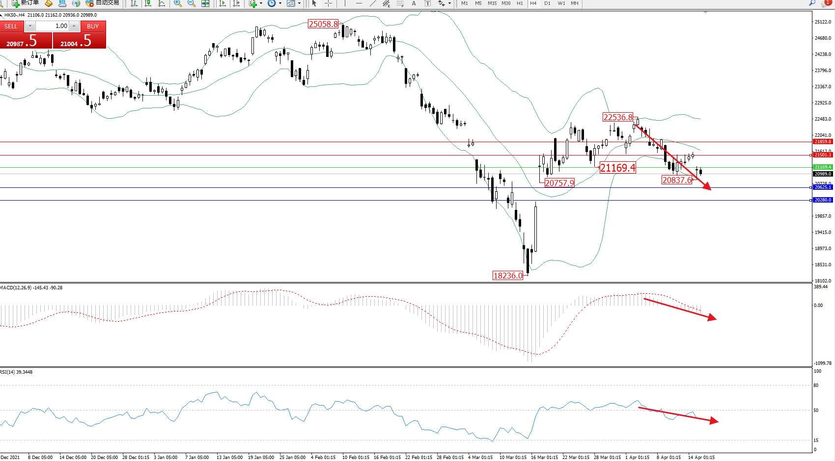 技术点评:空头动力延续布林带指标通道中下轨区间持续震荡下行,低位抵达20837位置后短暂震荡,空头动力有继续向下移动态势,布林带指标呈缓慢张口走势中,MACD指标处于0轴线下侧弱势徘徊中,RSI指标处于50均衡线下侧弱势整理向下移动中;