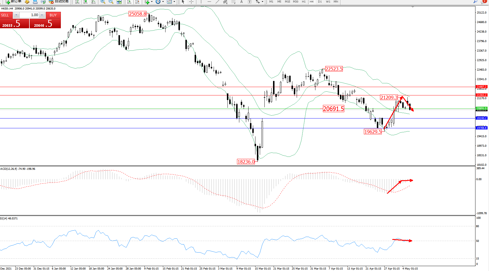 香港恒生指数5月5日(周四)收盘下跌76.12点,跌幅0.36%,报20793.4点;港股高开低走,午后市场情绪明显偏弱,尾盘三大指数均转跌。恒生科技指数收跌0.14%,盘初一度涨2.5%。大型科技股百度、快手、京东尾盘涨幅收窄,腾讯、网易分别转跌0.54%及1.67%;受国际油价、黄金走强影响,三桶油、黄金股全天表现强势,今日南下资金净流入5.1亿港元,大市成交额为1007亿港元。标普全球香港采购经理指数(PMI)显示,香港私营经济连续下降3个月后,4月重现扩张。4月份标普全球香港PMI经季节调整后,由上月的42.0升至51.7,反映私营经济恢复景气,并于连挫3个月后重回荣枯线上方,增长率更达去年11月以来最佳。