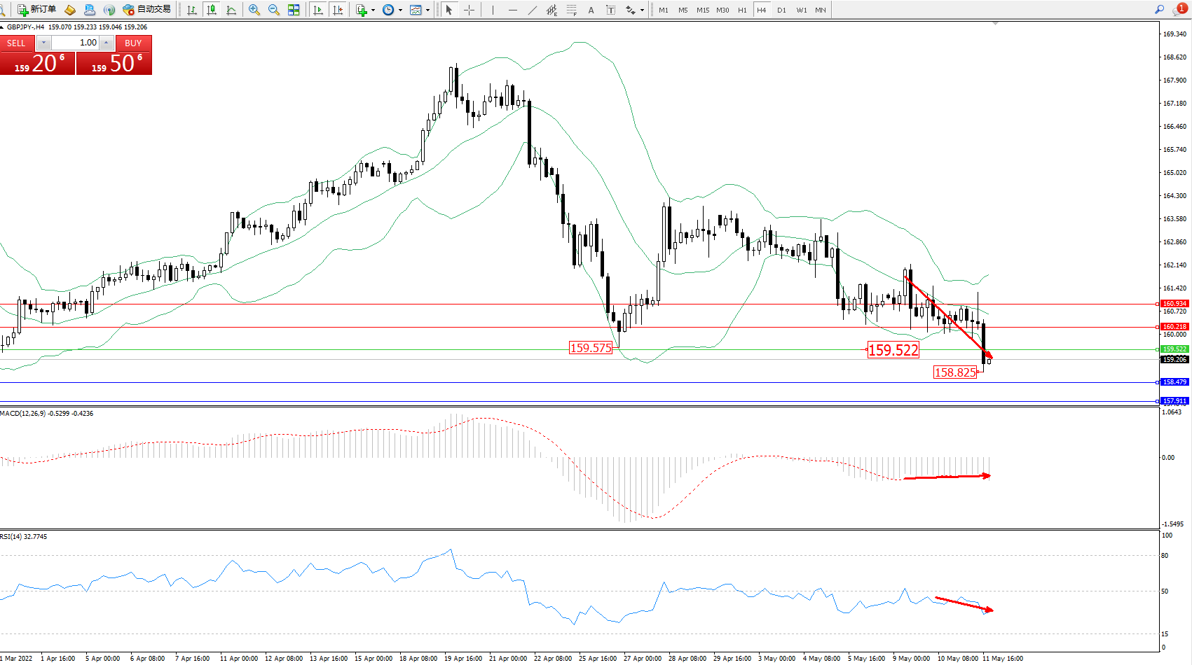 交易策略:159.522下方看跌,目标158.479、157.911