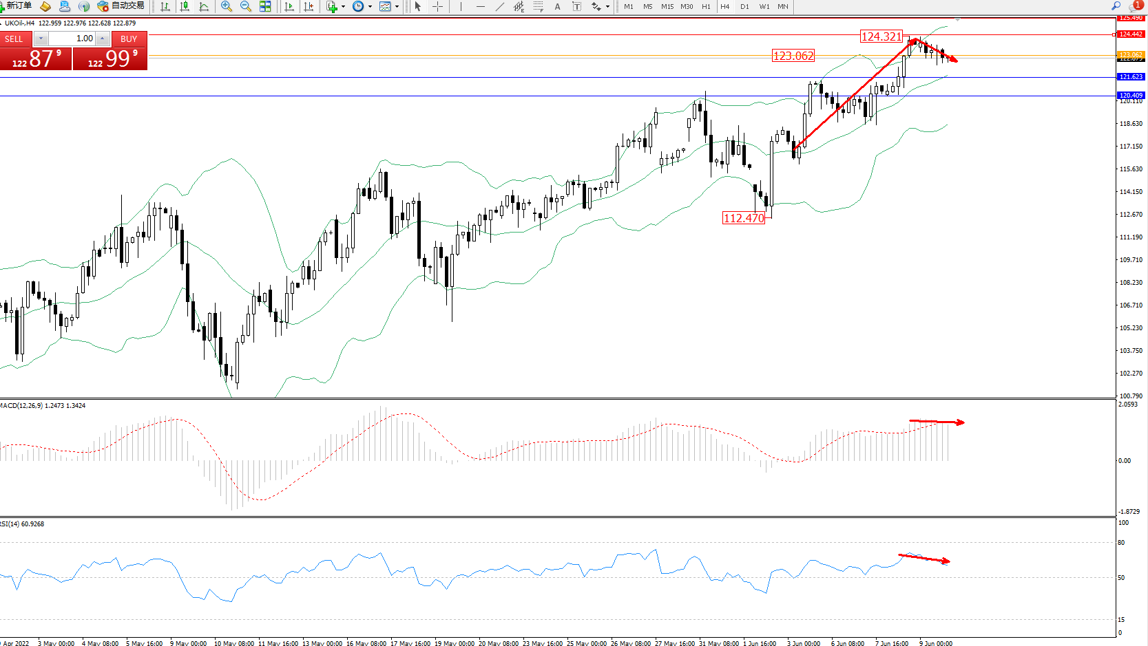 技术点评:多头动力延续布林带指标通道中上轨区间持续震荡上移,高位抵达124.321附近节点后整理,短期空头动力有伺机入场迹象,但市场依旧处于高位徘徊中,布林带指标呈上行趋势走势上移后开始收口,MACD指标处于多头区域维持整理平移,RSI指标处于多头区域维持弱势徘徊;