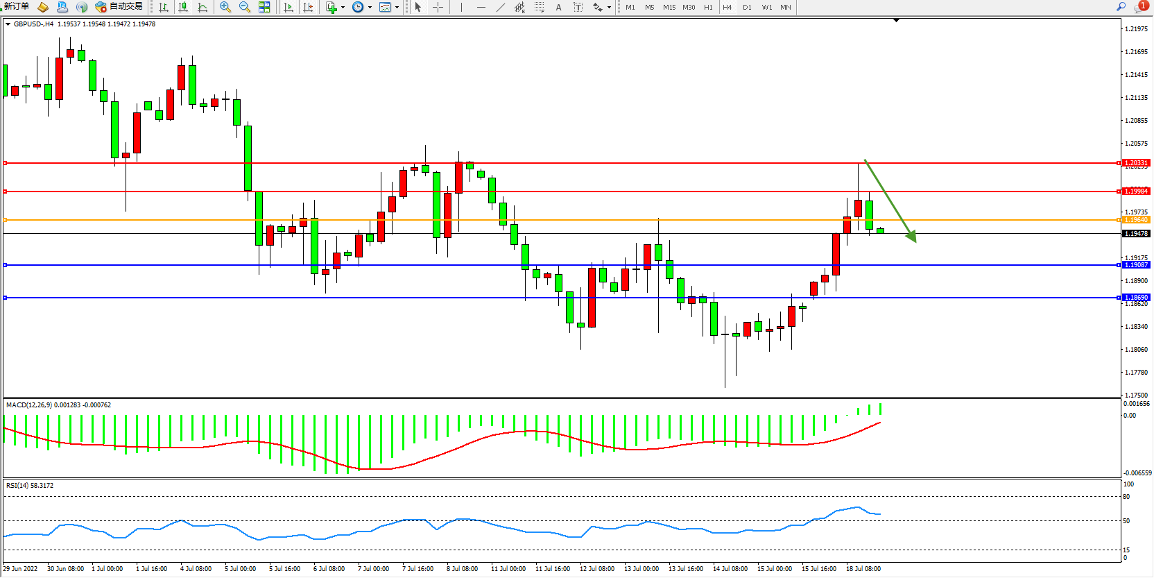 英镑兑美元冲高回撤1.19478附近震荡,受美元走强压抑,英镑也不得不低头向下滑落。英国的通胀也一样飙升到了9.1%,英国央行也在这期间释放了加息超过50个基点的信息,只不过投资者还不是那么笃定,而且美元的强势远远盖住了英镑的光芒。