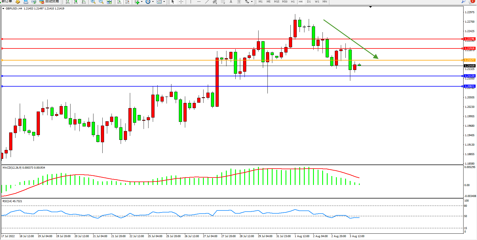 交易策略:1.21577下方看跌,目标1.21120、1.20821